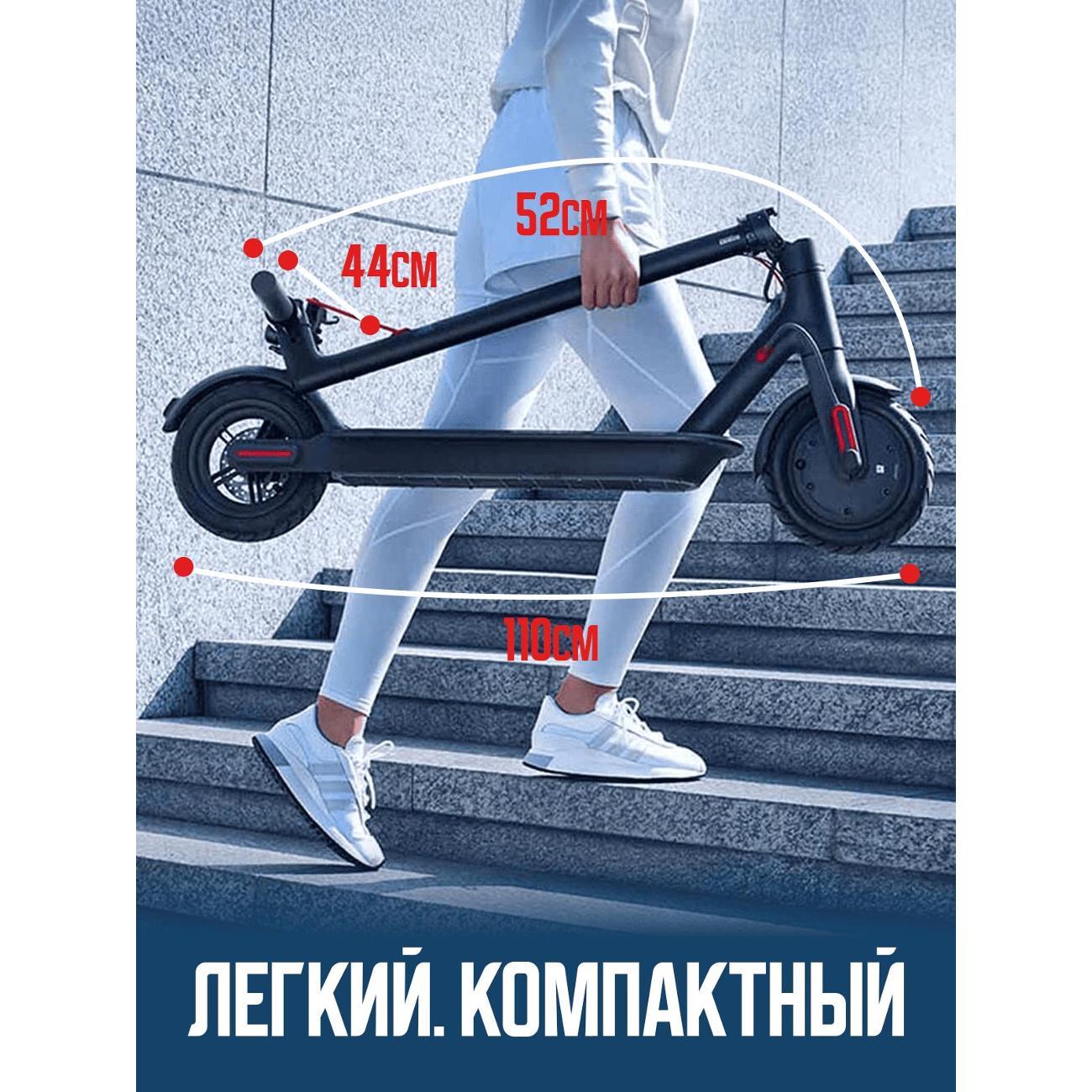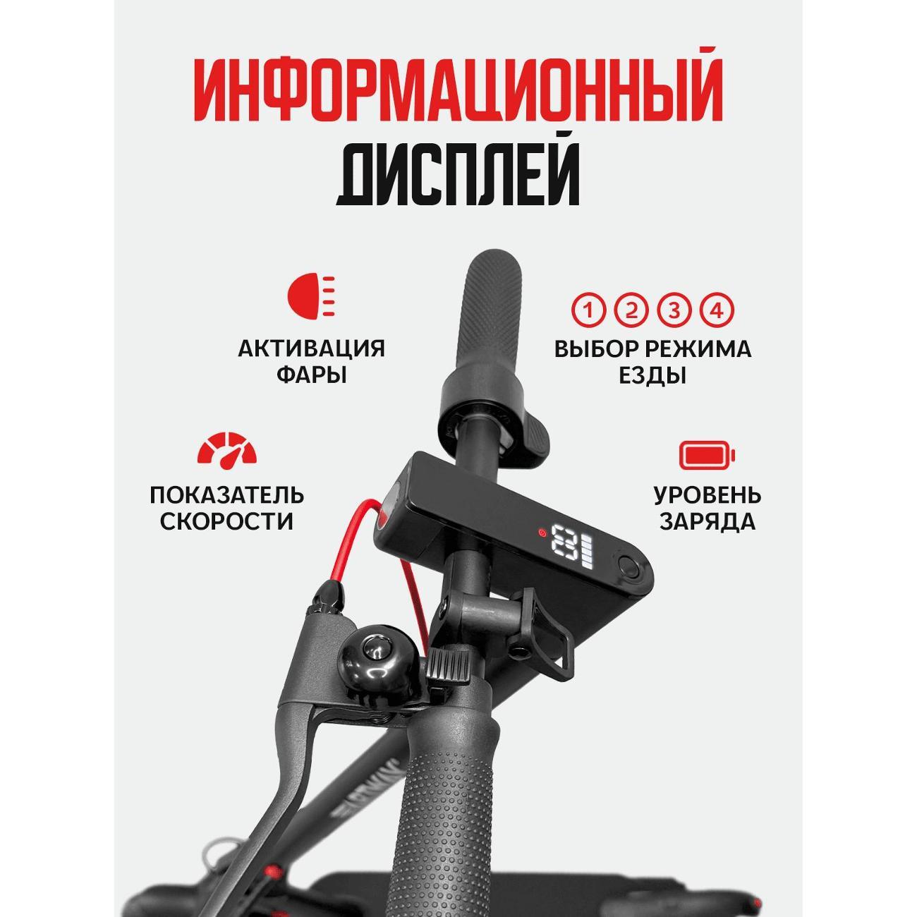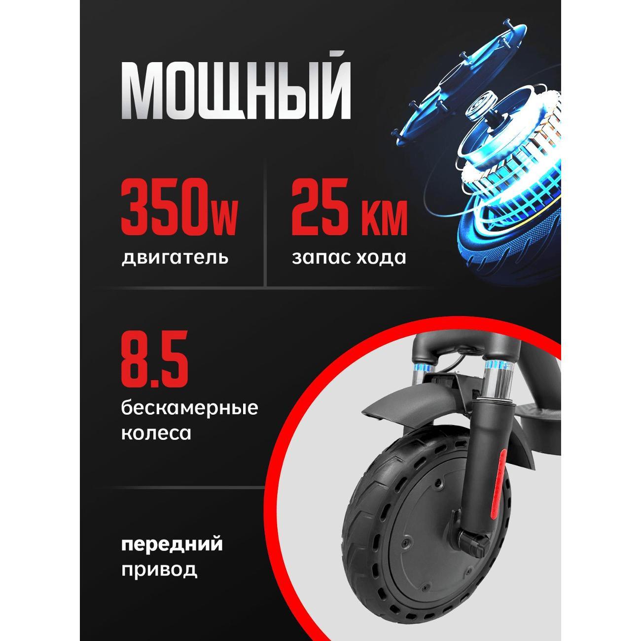 Дисковые тормоза обеспечивают быстрый сброс скорости. Литий-ионный аккумулятор емкостью 7500 мА*ч отличается высокой плотностью энергии и низким уровнем саморазряда. Номинальная мощность равна 350 Вт. Для полной зарядки требуется до 4 часов. Рамка-подножка позволяет оставить самокат в вертикальном положении и не прислонять его к стене или другой опоре. Зарядное устройство входит в комплект. Габаритные размеры — 120х120х45 см, вес — 13 кг.