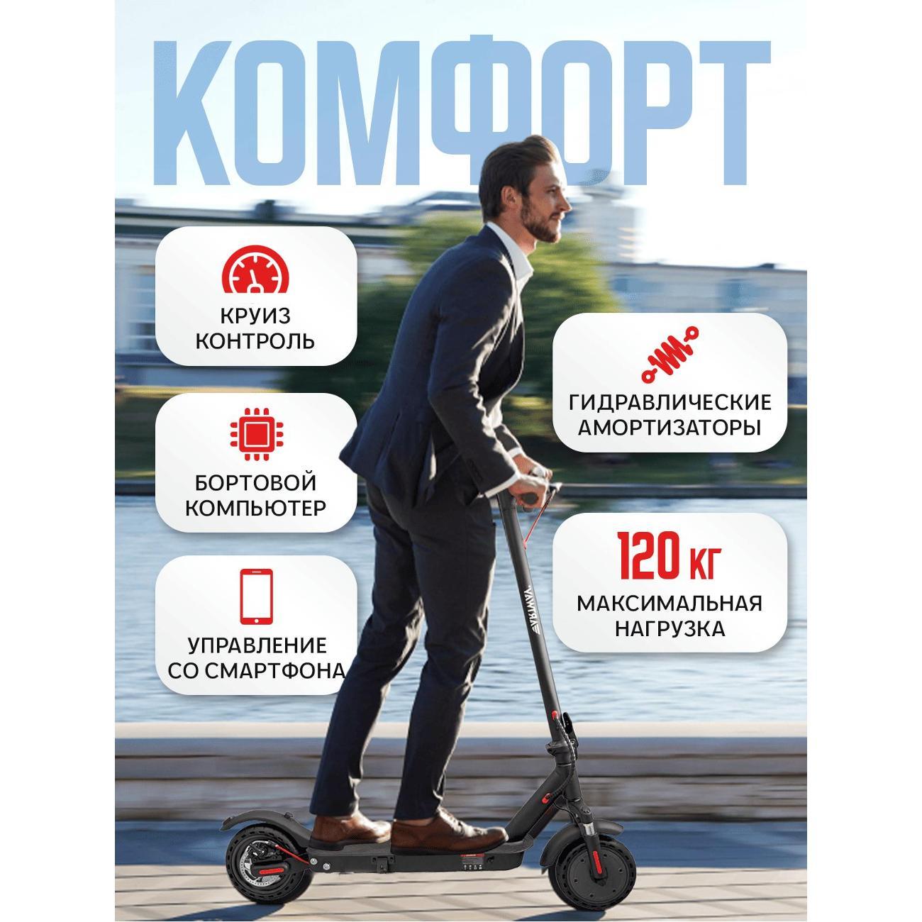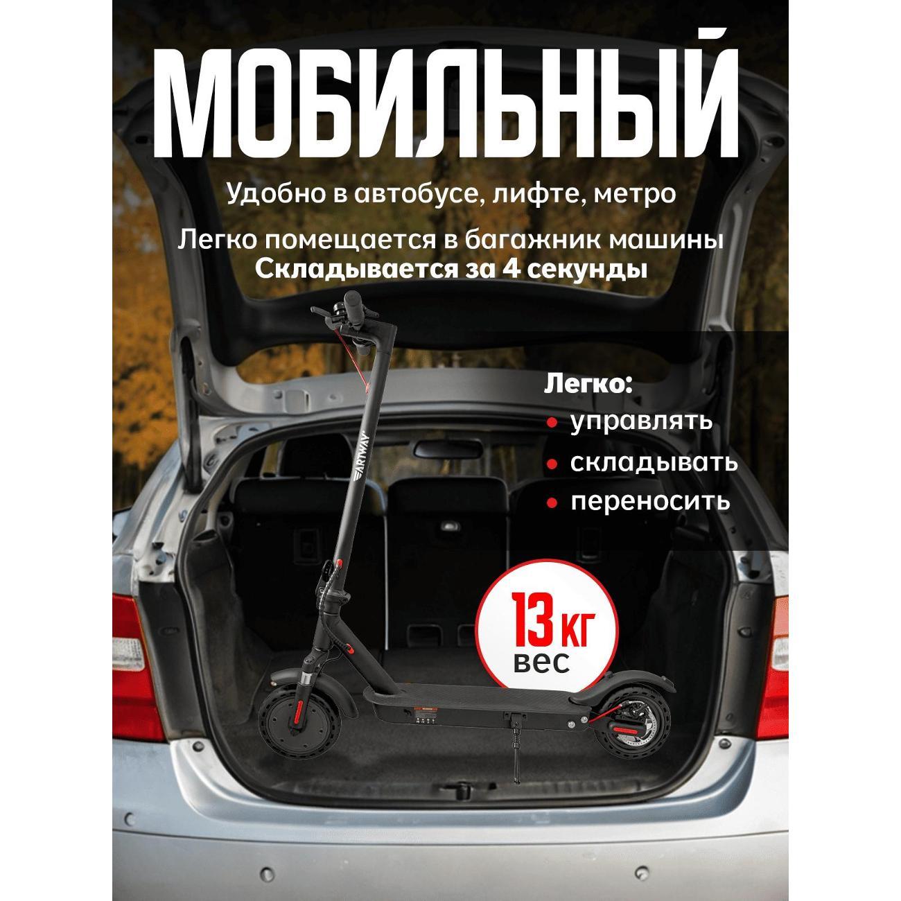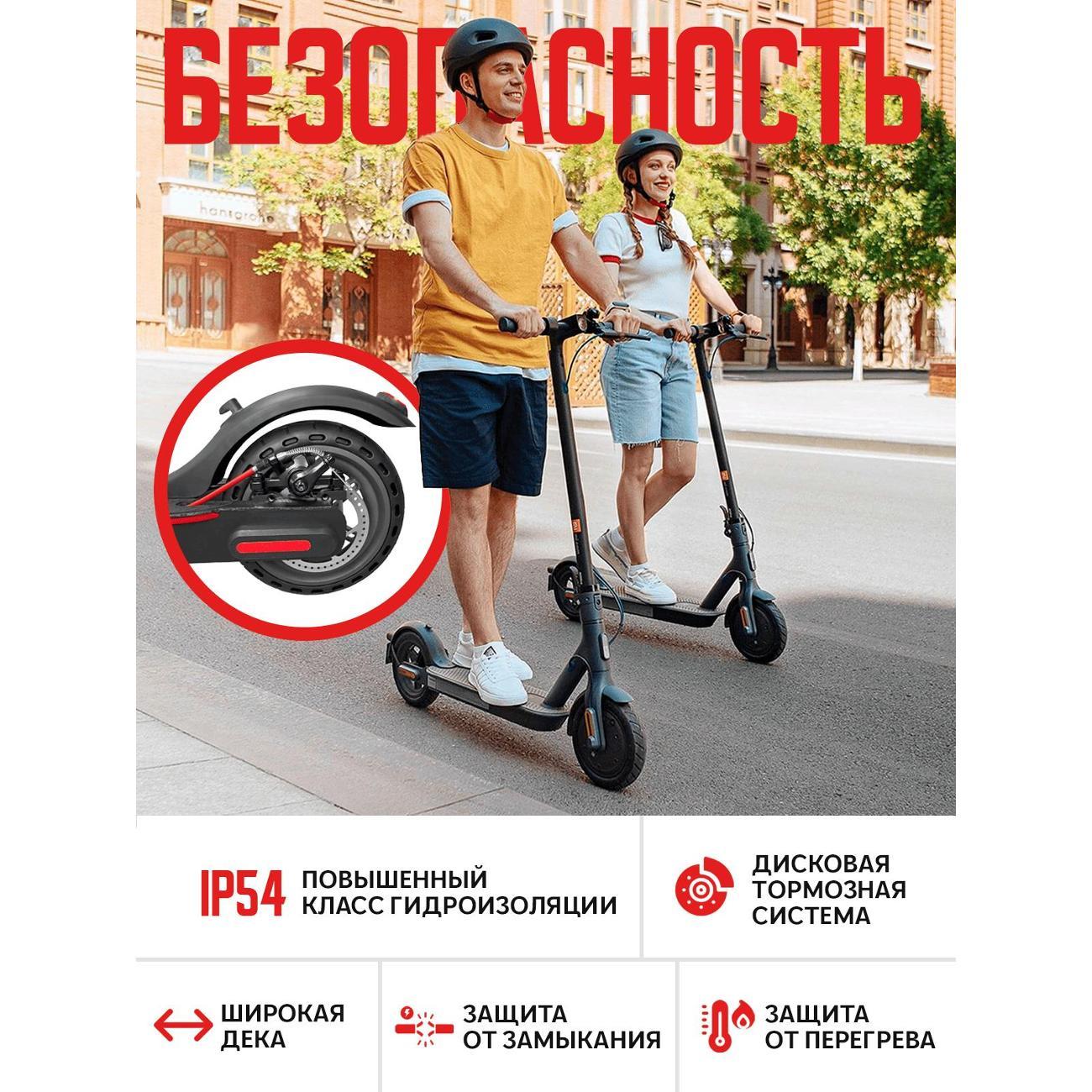 Дисковые тормоза обеспечивают быстрый сброс скорости. Литий-ионный аккумулятор емкостью 7500 мА*ч отличается высокой плотностью энергии и низким уровнем саморазряда. Номинальная мощность равна 350 Вт. Для полной зарядки требуется до 4 часов. Рамка-подножка позволяет оставить самокат в вертикальном положении и не прислонять его к стене или другой опоре. Зарядное устройство входит в комплект. Габаритные размеры — 120х120х45 см, вес — 13 кг.