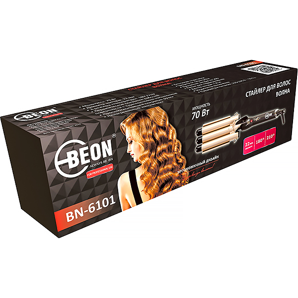 Электрощипцы Beon BN-6101 диаметром 22 мм работают в двух температурных режимах (180°С и 210°С), снабжены подставкой, наконечник не нагревается. Корпус выполнен из термостойкого пластика, керамическое покрытие нагревательного элемента предотвращает повреждение волос.
