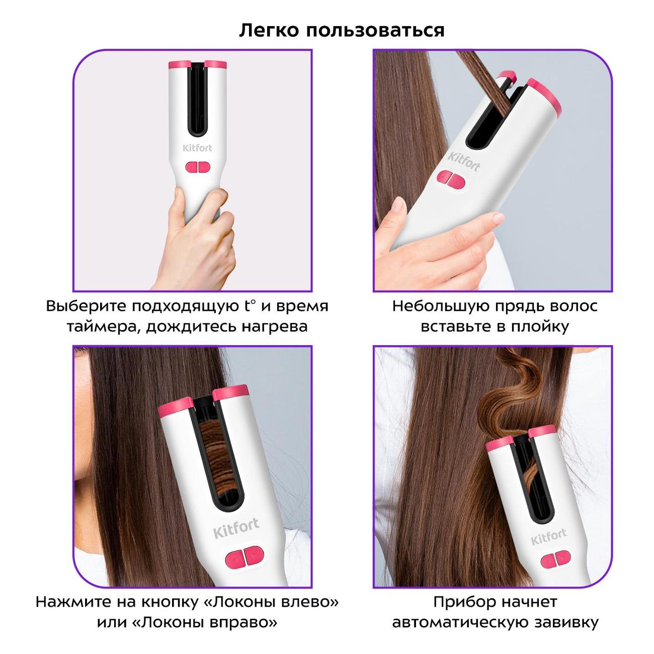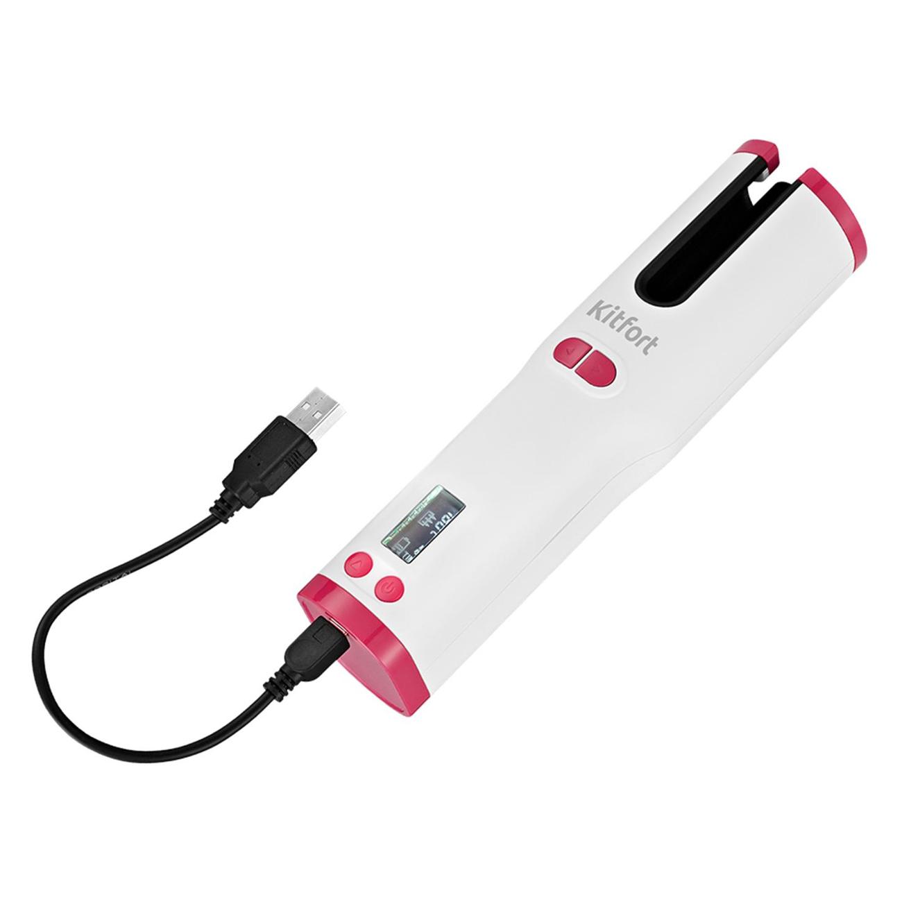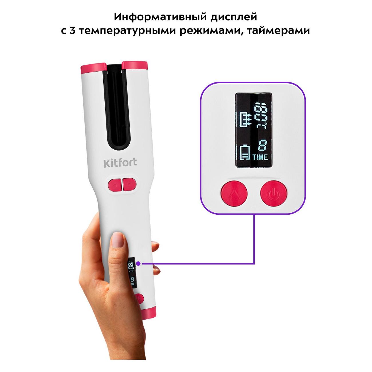 Стайлер Kitfort КТ-3235 работает на встроенном аккумуляторе и поддерживает три температурных режима. На корпусе бело-розового цвета находится информативный дисплей и индикация, оповещающая о включении, режиме работы и температуре.