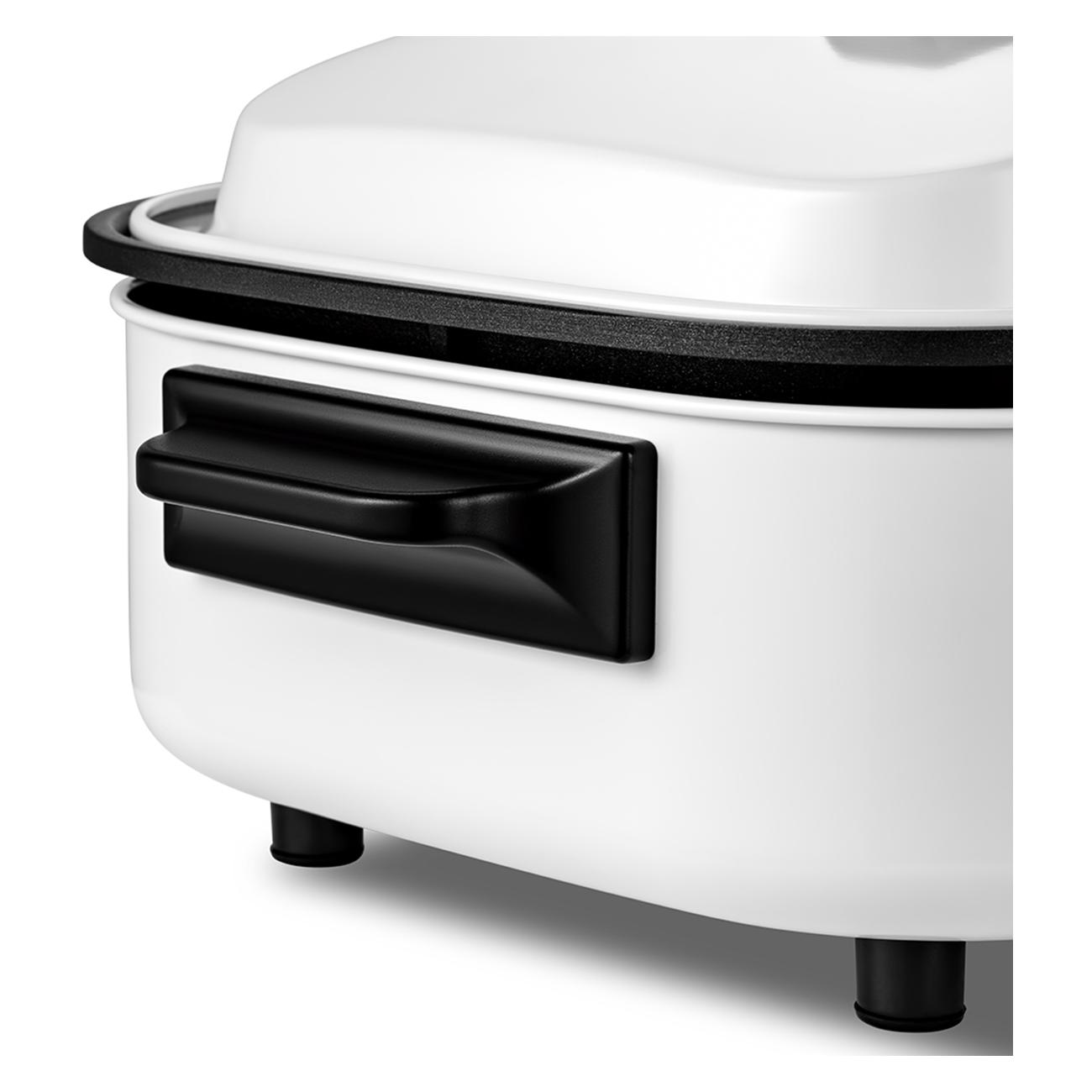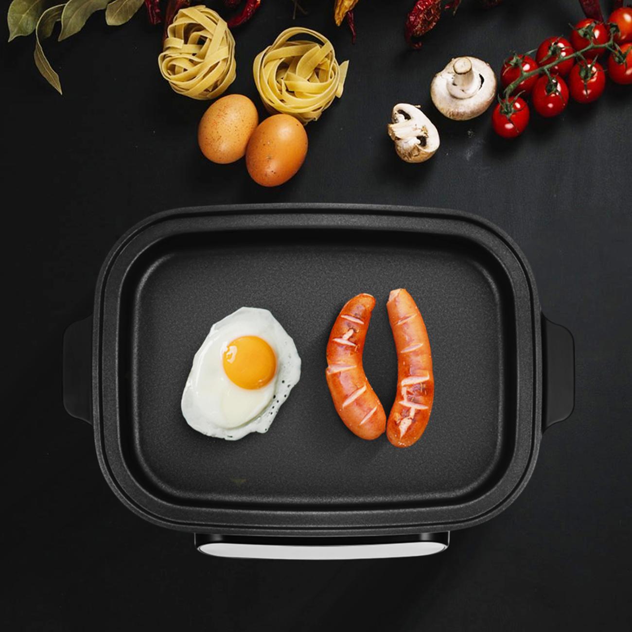 Внутренняя поверхность электросковороды произведена из алюминия и покрыта антипригарным составом, что позволяет использовать минимум масла и облегчает очистку чаши. При подключении к электросети сковорода издает звуковой сигнал. В комплект входят две емкости: непосредственно сковорода (1,6 л) и сотейник (4 л). Также присутствует стимер для приготовления паровых блюд. Длина сетевого кабеля составляет 80 см.