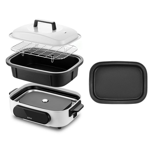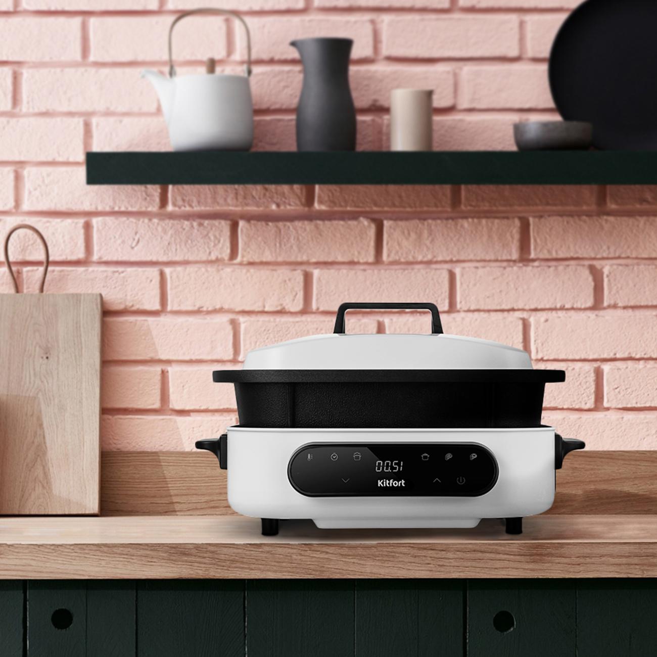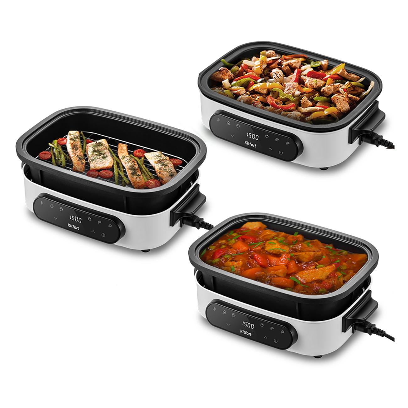Электросковорода-гриль Kitfort КТ-2087 в корпусе черно-белой расцветки оснащена дисплеем и сенсорной панелью управления. Мощность прибора регулируется в диапазоне от 300 Вт до 1200 Вт. У электросковороды четыре режима работы: «Стейк», «Жарка», «Тушение», «Пар». Модель оснащена ручками для удобства транспортировки.