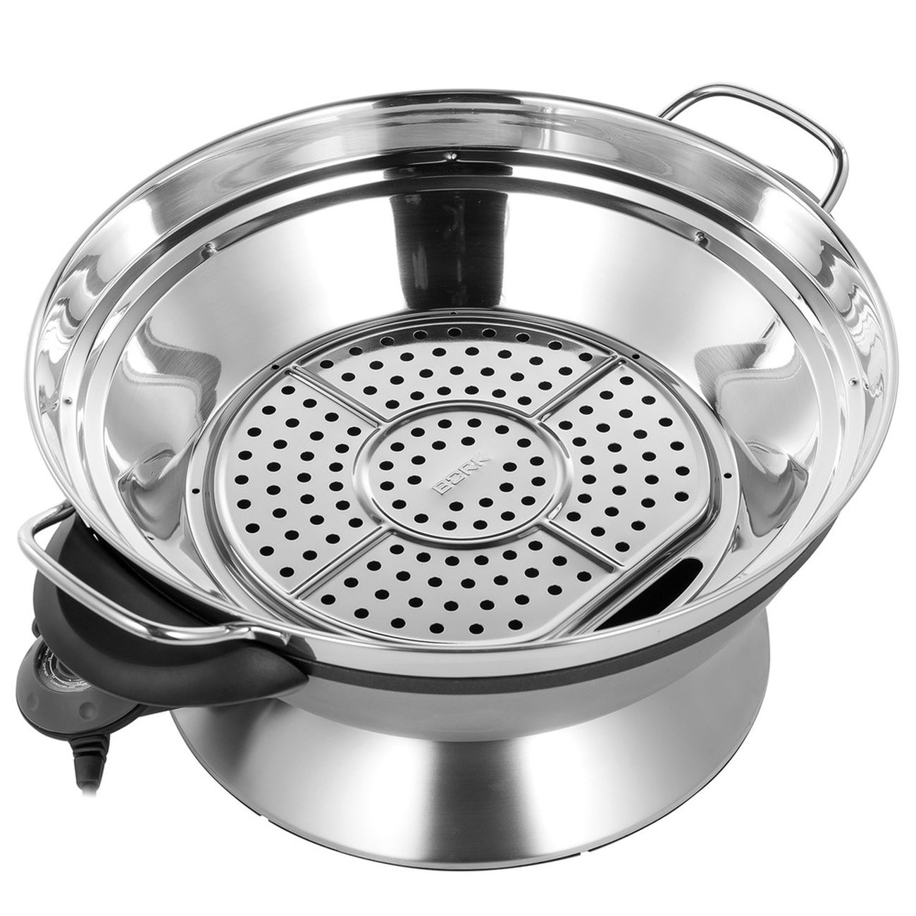 С недавних чудесных пор пользуюсь для приготовления разных блюд этой замечательной посудой. Это по своей сути сковорода, но она годится и для приготовления супа, и для обалденного мяса на гриле. Единственное, что выпечки не годится. Достоинств у модели масса, начиная с шести режимов для приготовления пищи и завершая качественными материалами. Комплектация состоит из поддона-дуршлага, чтобы готовить на пару. Долив воды возможен без снятия крышки. Блюда получаются диетическими.
