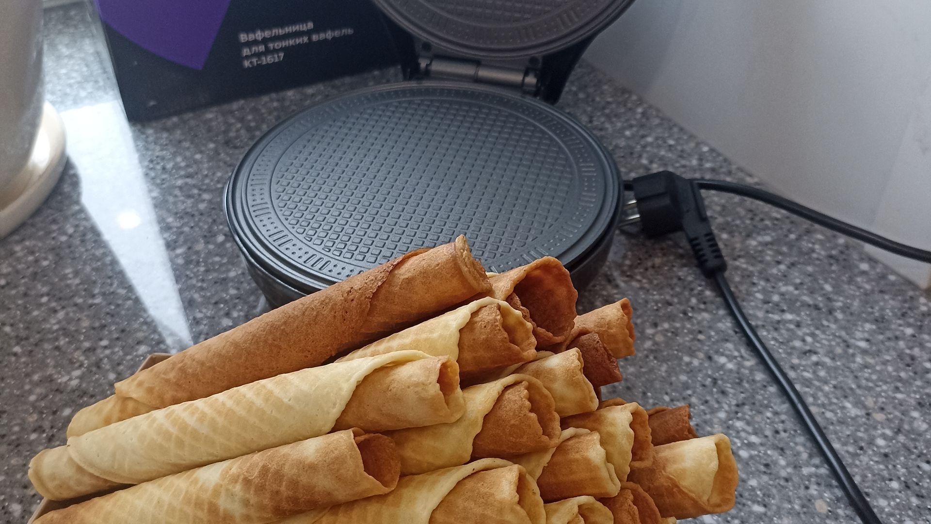 Отличная вафельница для тонких вафель. Вафли получаются нежнейшие, очень вкусные. Антипригарное покрытие работает на отлично, вафли пропекаются быстро. Снизу прорезиненные ножки, чтобы прибор не скользил.