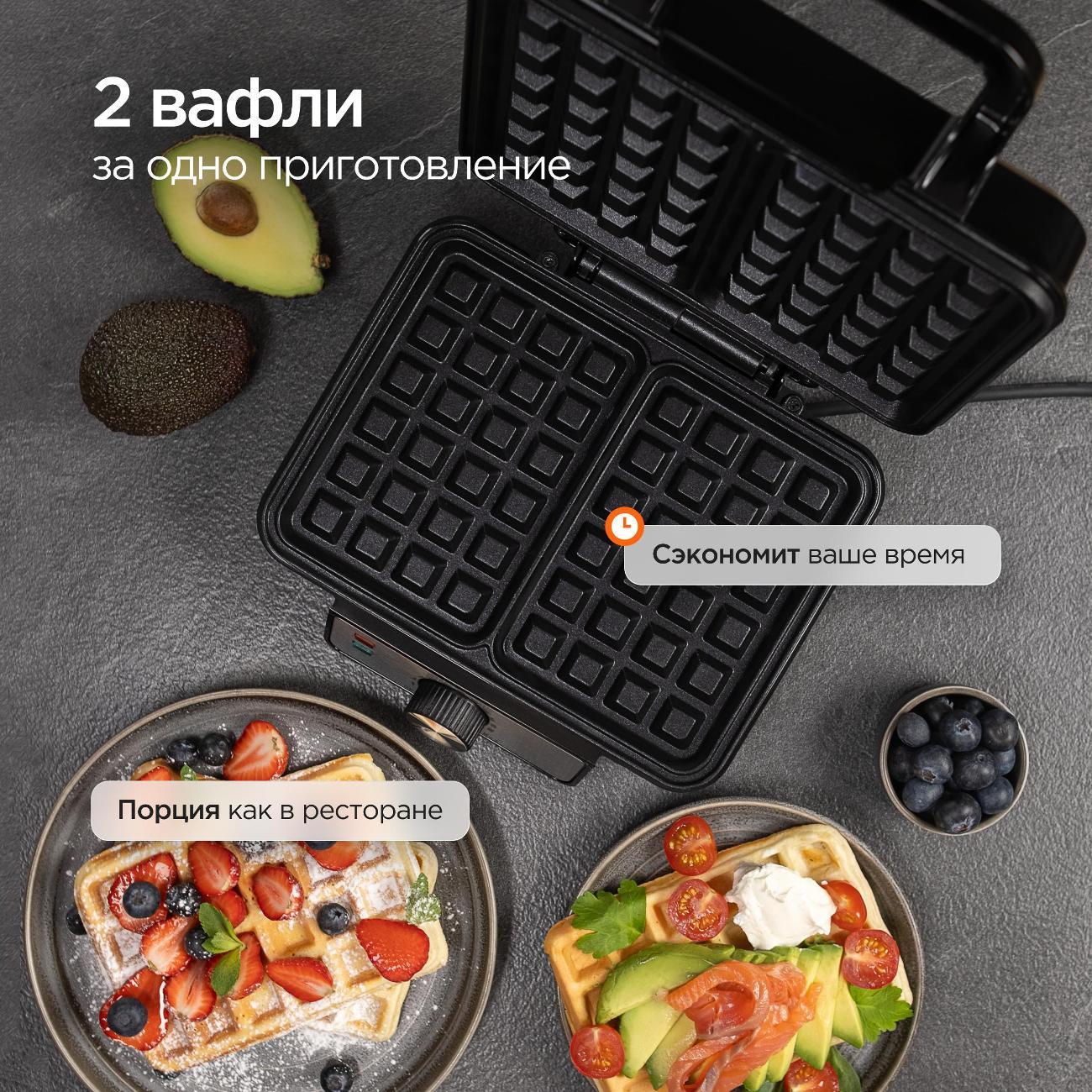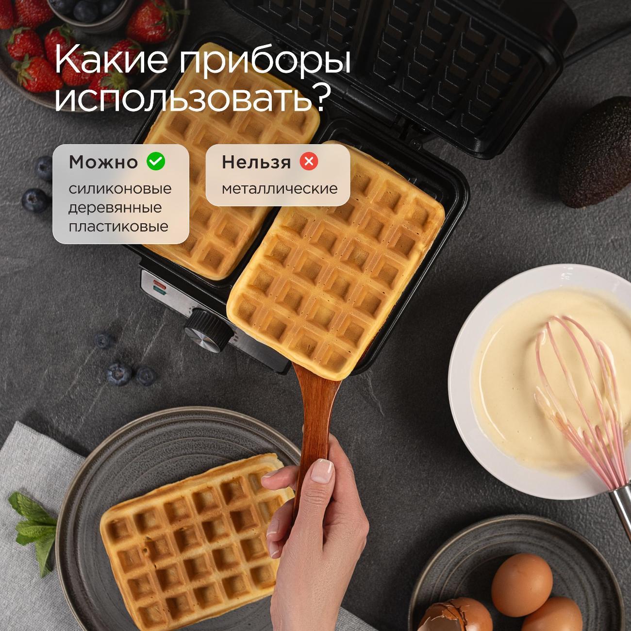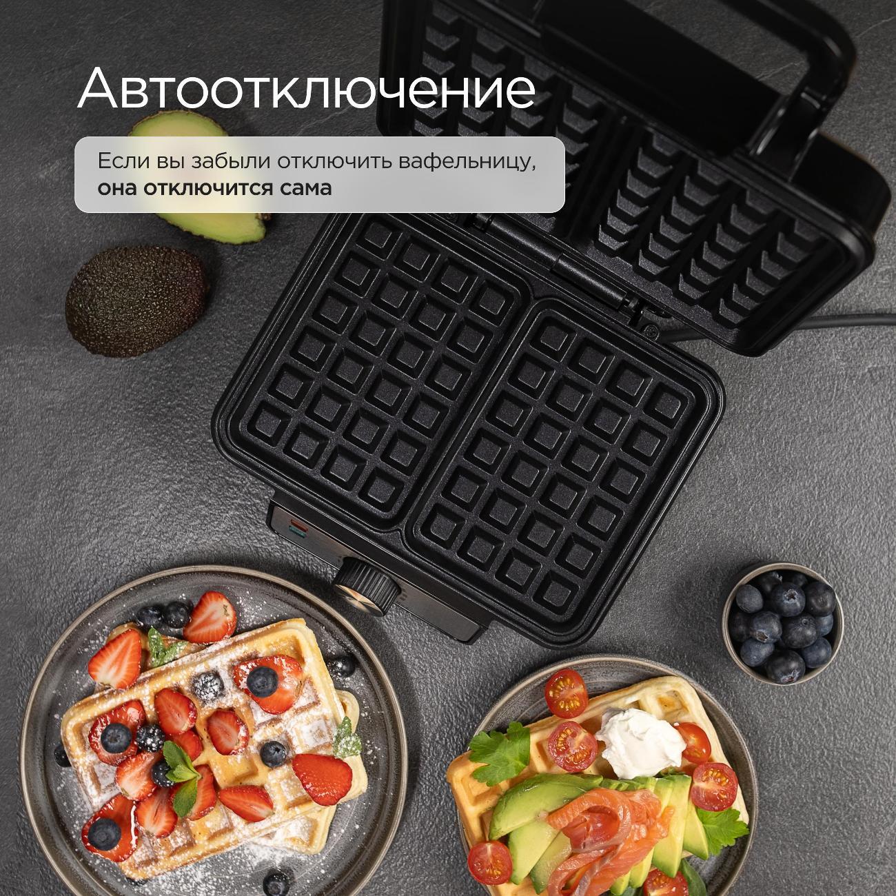 Вафельница оснащена автоматическим отключением — если вы вдруг отвлеклись, прибор позаботится о себе сам. Термоизолированная ручка гарантирует, что вы не обожжетесь, даже если готовите несколько порций подряд.