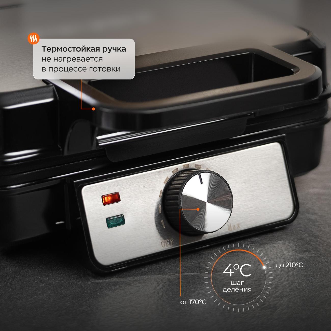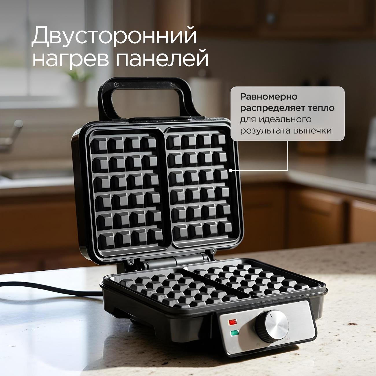 Механический регулятор температуры позволяет вам выбирать интенсивность нагрева (до 210°C) в зависимости от рецепта. Хотите нежные вафли или хрустящие? Легко!