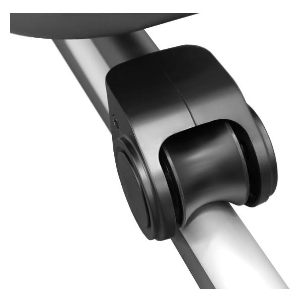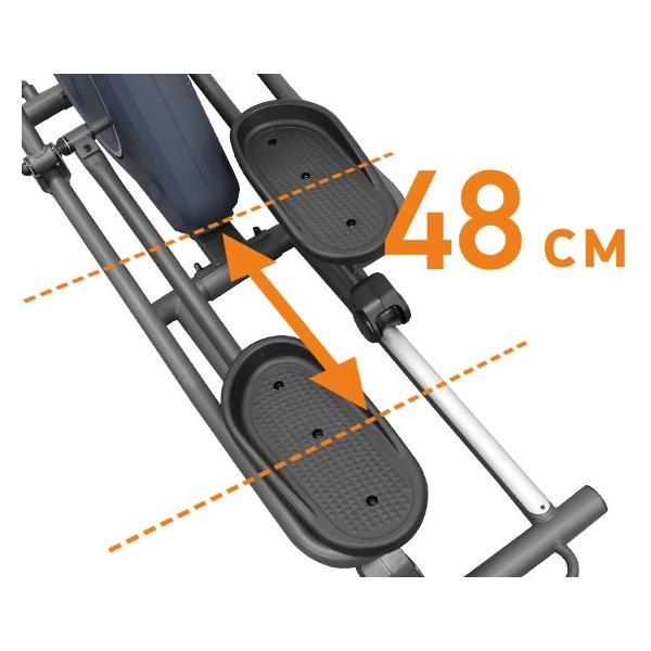 Педали большого размера оснащены противоскользящим покрытием. Встроен большой цифровой дисплей, на котором можно просмотреть данные о средней скорости ходьбы, пройденной дистанции и времени тренировки. Модель способна считывать уровень пульса при помощи датчика, размещенного в рукоятях. Эллипсоид подключается к электрической сети с напряжением питания 220 В.