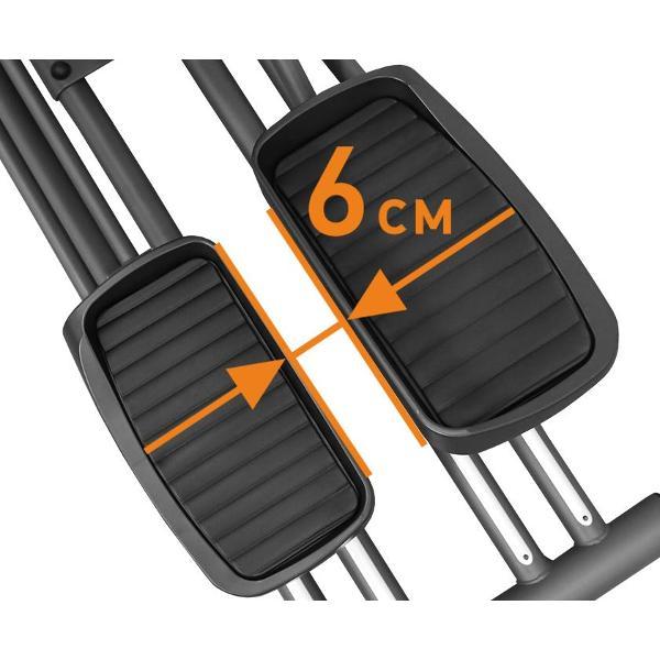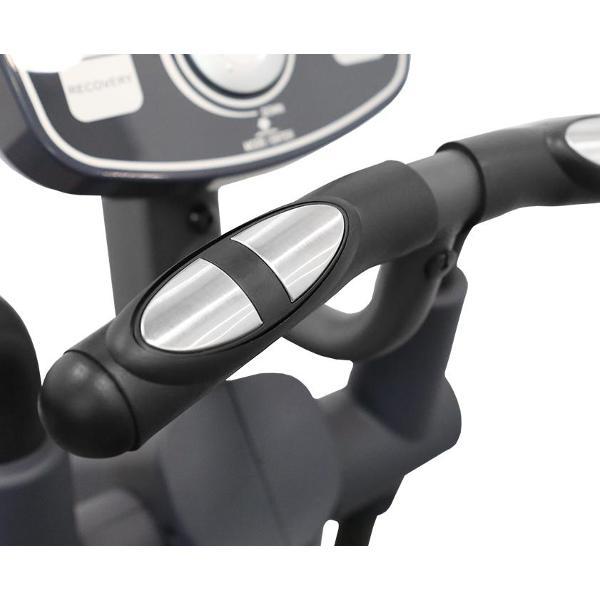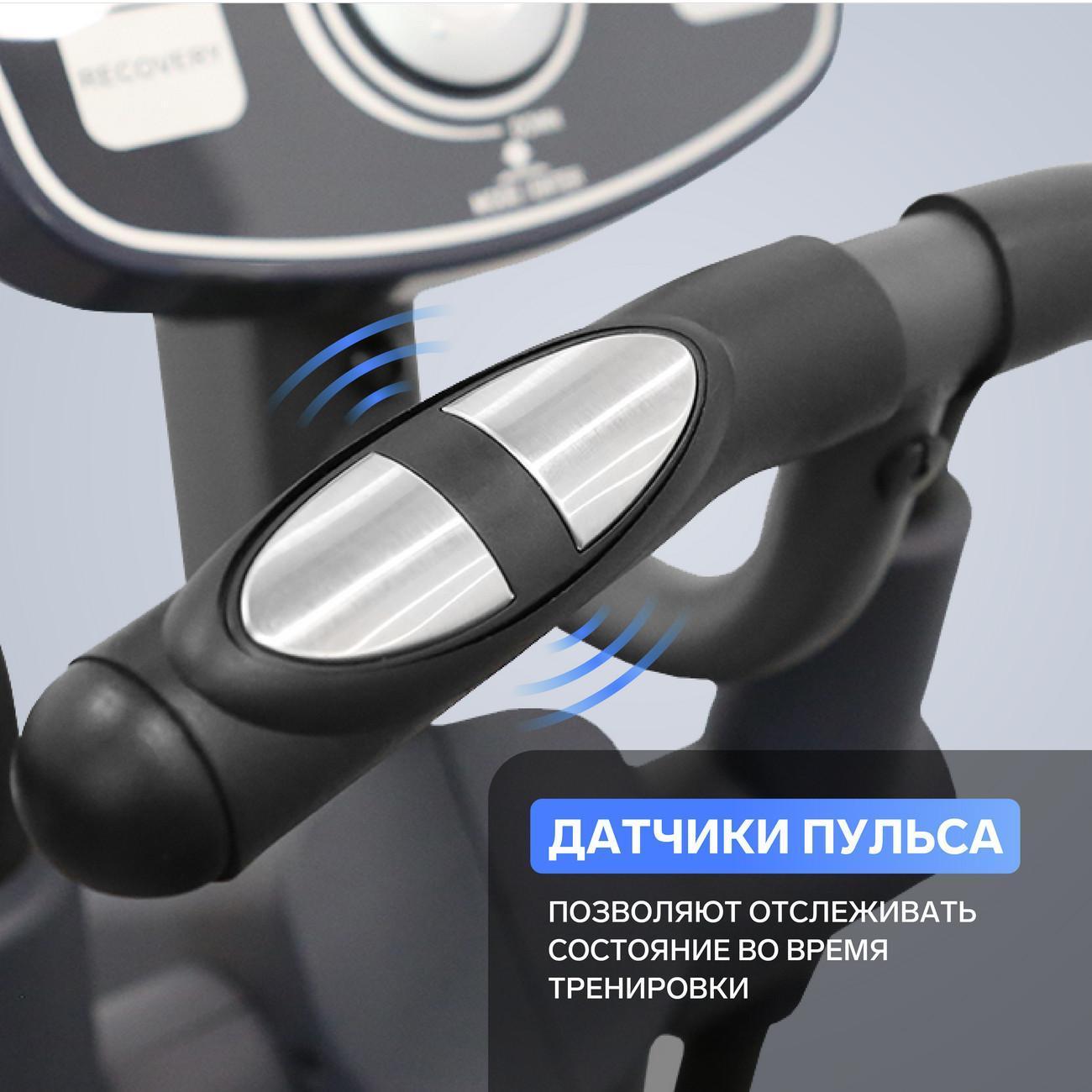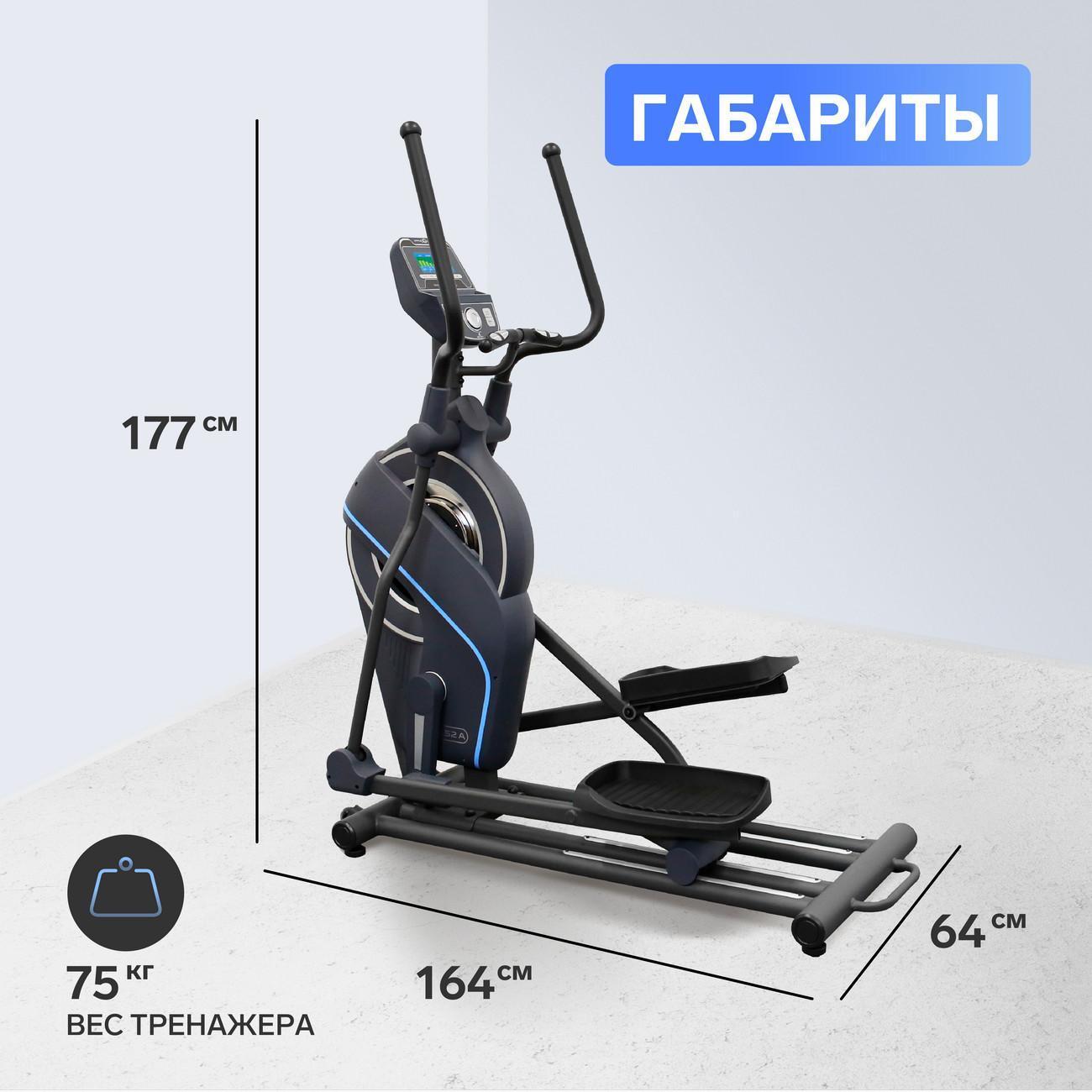 Педали большого размера оснащены противоскользящим покрытием. Встроен большой цифровой дисплей, на котором можно просмотреть данные о средней скорости ходьбы, пройденной дистанции и времени тренировки. Модель способна считывать уровень пульса при помощи датчика, размещенного в рукоятях. Эллипсоид подключается к электрической сети с напряжением питания 220 В.