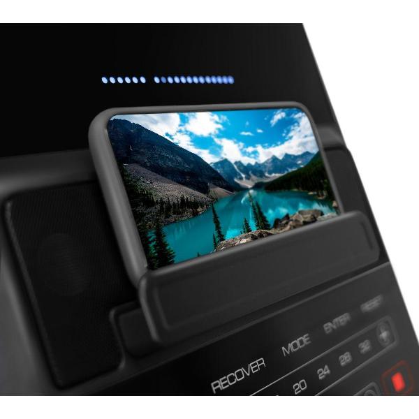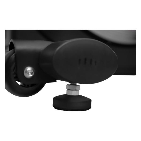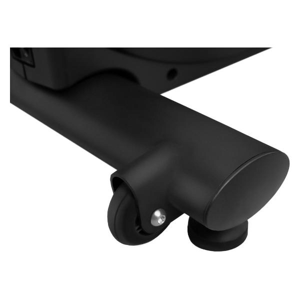 Сдвоенные полиуретановые ролики позволяют без усилий перемещать тренажер в разные места и обеспечивают его устойчивость. Компенсаторы помогут нивелировать неровности пола. Эта модель оборудована подставкой для смартфона, разъемами USB и AUX и колонками.