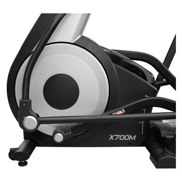 Эллипсоид Bronze Gym X700M — полупрофессиональная модель, обеспечивающая высокую эффективность и безопасность занятий. Рама сделана из высокопрочного металла. Тренажер выдерживает нагрузку до 160 кг. Устройство оборудовано магнитной приводной системой PMS и инерционным маховиком весом 23 кг. За счет переднего расположения легко настраивается траектория движения. Длина шага составляет 50,8 см. Педали снабжены антискользящими накладками.
