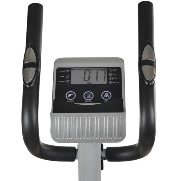 Длина шага эллипсоида — 36 см, число уровней нагрузки — 8. Магнитная система регулирования нагрузки обеспечивает плавное переключение режимов. Тренажер оснащен встроенным компьютером с LCD-дисплеем, благодаря которому можно отслеживать количество затраченных калорий, частоту сердечных сокращений, скорость, дистанцию и время тренировки. Нескользящие педали обеспечивают максимальный комфорт и исключают риск травматизма. Дополнительные опции модели: транспортировочные ролики и компенсаторы неровностей пола.