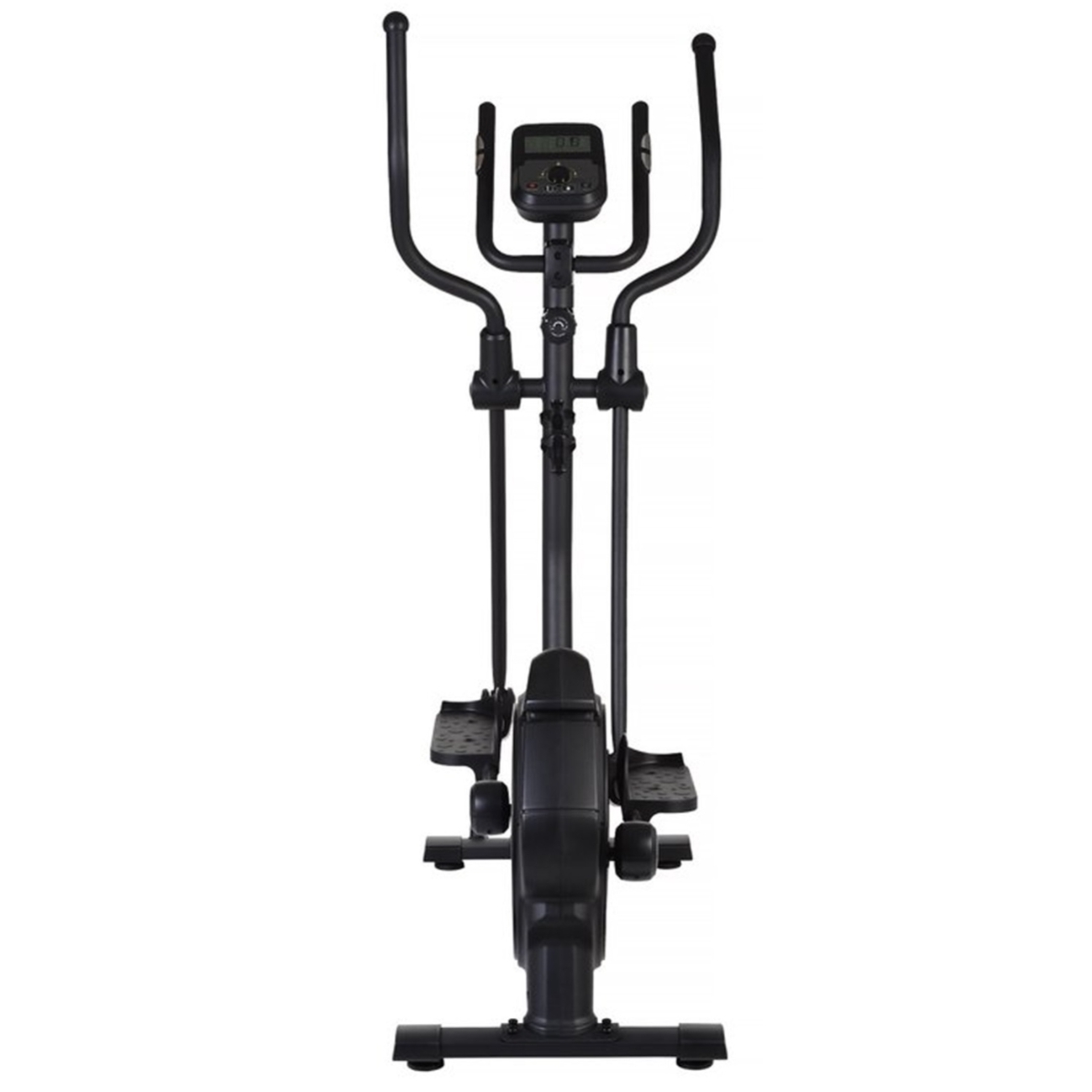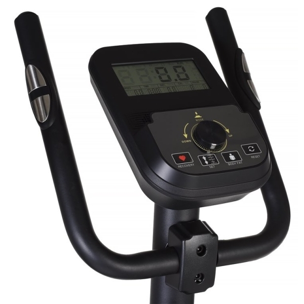 На передней панели располагается цифровой дисплей. Там можно увидеть количество пройденных километров, показатели пульса, число израсходованных калорий и другие сведения. Дополнительные конструктивные элементы тренажера: транспортировочные колесики и компенсаторы неровностей пола.
