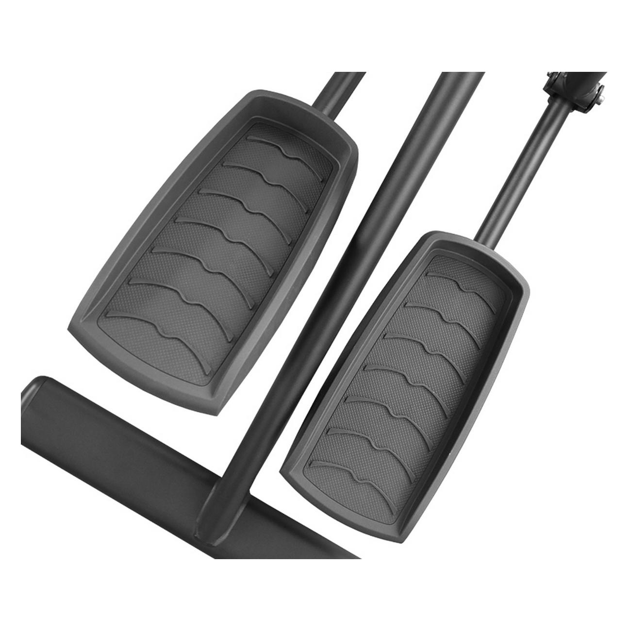 Педали у эллипсоида прорезиненные, нескользящие. Расстояние между ними — 9 см. Длину шага можно регулировать, выбирая значение 46 см, 51 см, 58 см. Для измерения частоты пульса предусмотрены сенсорные датчики.