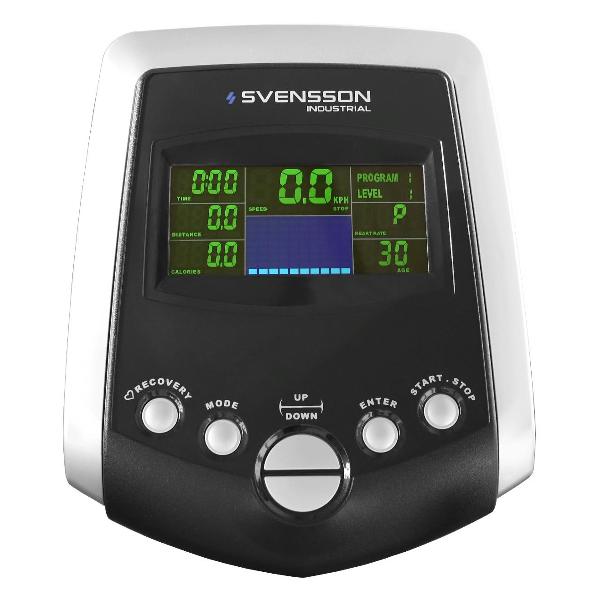 Эллипсоид Svensson Industrial Base X550 черного цвета оснащен переднеприводной безрельсовой рамой. Она покрыта антикоррозийным составом и окрашена в один слой. Регулировка угла наклона механическая (5-15%). Тренажер оснащен электромагнитной системой нагружения с 16 уровнями нагрузки. Инерционный вес маховика составляет 25 кг.