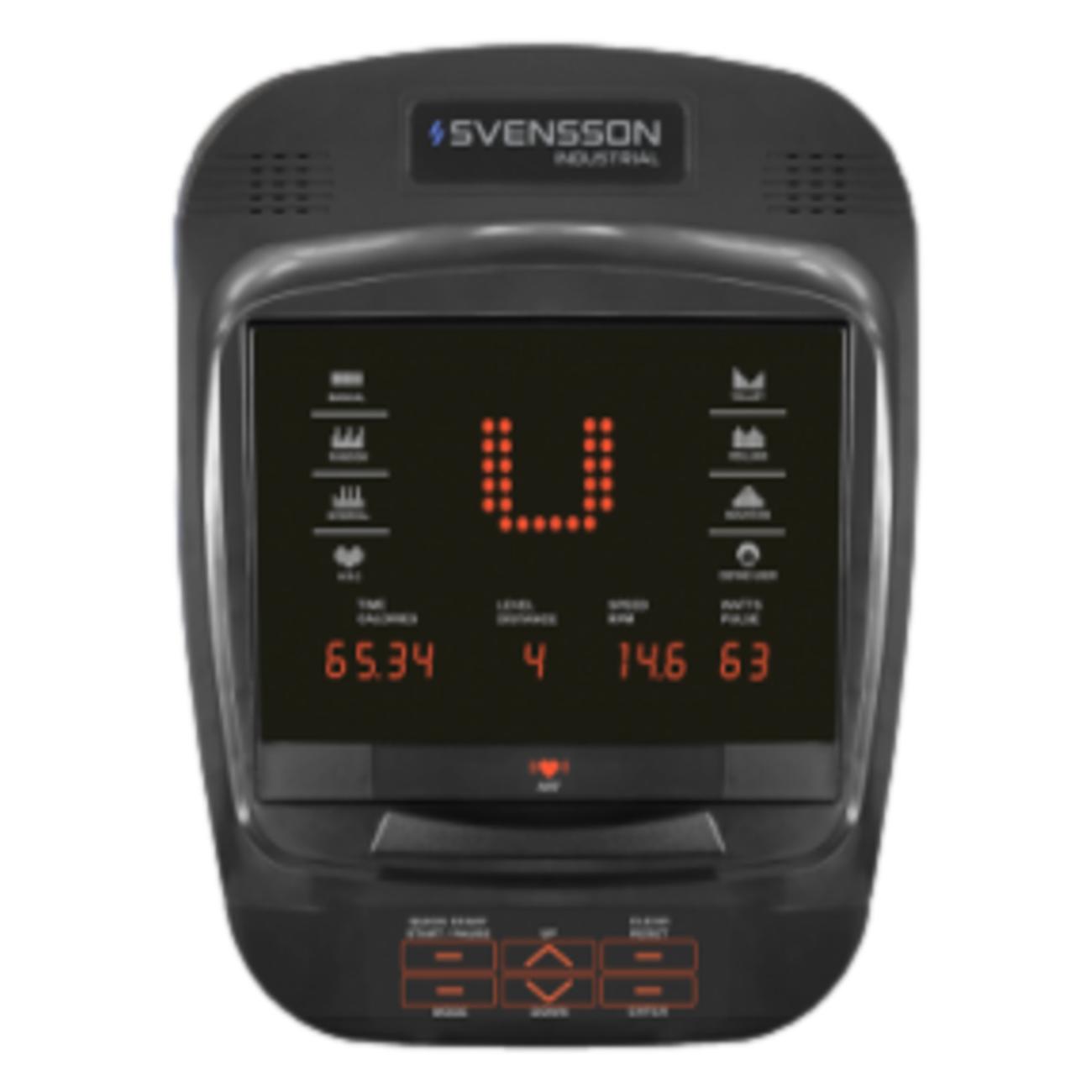 Эллипсоид Svensson Industrial Hit AMT870 черно-серой расцветки оснащен 20 уровнями нагрузки и 11 предустановленными программами тренировок. Длина его шага составляет 92 см. Система нагружения у тренажера электромагнитная. На корпусе есть цифровой дисплей с индикаторами пройденной дистанции, израсходованных калорий, частоты сердечных сокращений, времени тренировки и выбранной скорости. Модель оснащена держателем для бутылки, подставкой для аксессуаров, компенсаторами неровностей пола, транспортировочными колесиками. В комплект входит набор ключей для сборки тренажера.