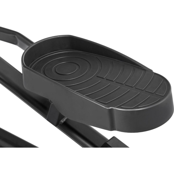 Тренажер оснащен 24 уровнями нагрузками. В конструкции предусмотрен маховик весом 13 кг. Педали обладают нескользящими платформами оптимальной формы, исключающими соскальзывание ноги в процессе эксплуатации. Длина шага составляет 46 см. На цифровом дисплее отображается вся необходимая информация: пульс, расход калорий, скорость и пройденная дистанция. Транспортировочные ролики придают эллипсоиду мобильности. В комплект входит подставка для аксессуаров.