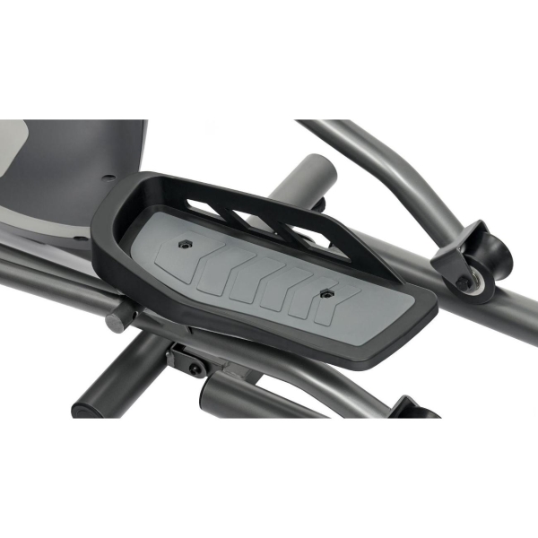 Привод тренажера — передний. Вес маховика равен 15,4 кг. За счет увеличенных педалей с рифленой поверхностью создаются максимально комфортные условия для проведения занятий. Длина шага равна 36 см. При вращении уменьшается нагрузка на колени и позвоночник. Транспортировочные ролики позволяют легко и быстро перемещать эллипсоид. Компенсаторы неровностей пола дают возможность выравнивать модель на поверхности. Конструкцией предусмотрена подставка под телефон. На черно-белый экран выводится информация о процессе тренировки. Язык интерфейса — английский. В комплекте поставляется набор ключей для сборки.