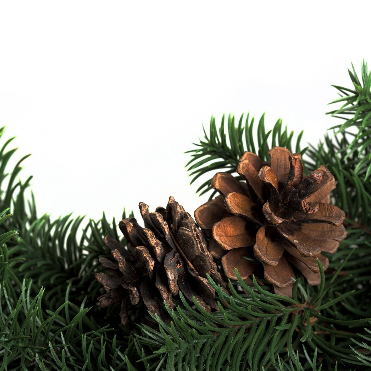 Изделие выполнено в форме пушистых хвойных веточек, для изготовления которых применяется мягкий синтетический материал, благодаря чему их кончики не колются. С целью дополнения композиции и придания ей большей реалистичности добавлены шишки.