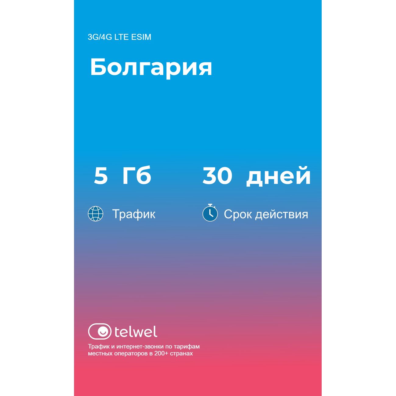 Вы можете купить eSIM Telwel пакет Болгария 5Гб 30 дней в магазинах М.Видео по доступной цене. eSIM Telwel пакет Болгария 5Гб 30 дней: подробное описание, фото и отзывы реальных покупателей, характеристики, возможность скачать инструкции и подобрать аксессуары.