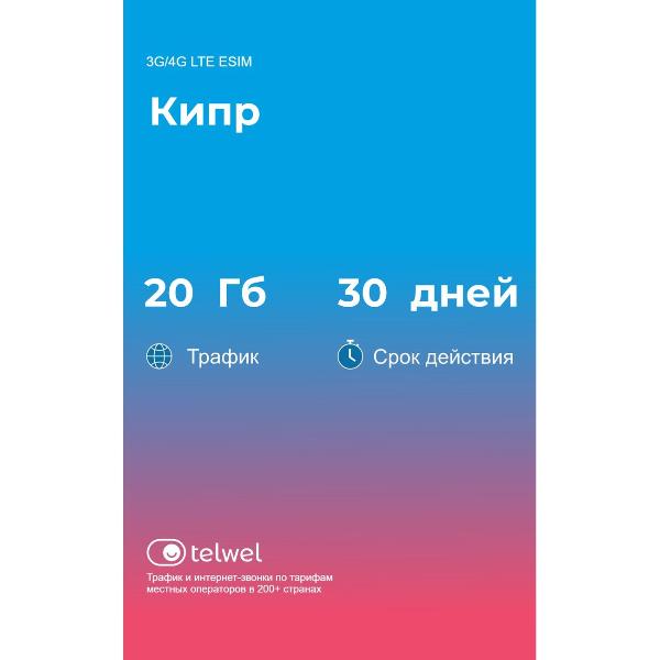 Вы можете купить eSIM Telwel пакет Кипр 20Гб 30 дней в магазинах М.Видео по доступной цене. eSIM Telwel пакет Кипр 20Гб 30 дней: подробное описание, фото и отзывы реальных покупателей, характеристики, возможность скачать инструкции и подобрать аксессуары.