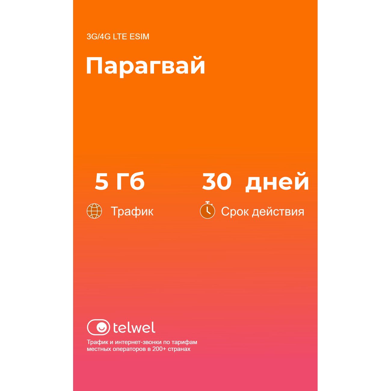Вы можете купить eSIM Telwel пакет Парагвай 5Гб 30 дней в магазинах М.Видео по доступной цене. eSIM Telwel пакет Парагвай 5Гб 30 дней: подробное описание, фото и отзывы реальных покупателей, характеристики, возможность скачать инструкции и подобрать аксессуары.