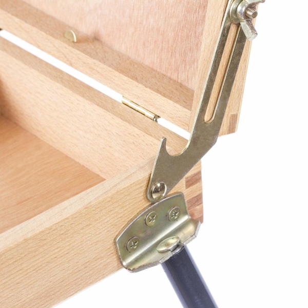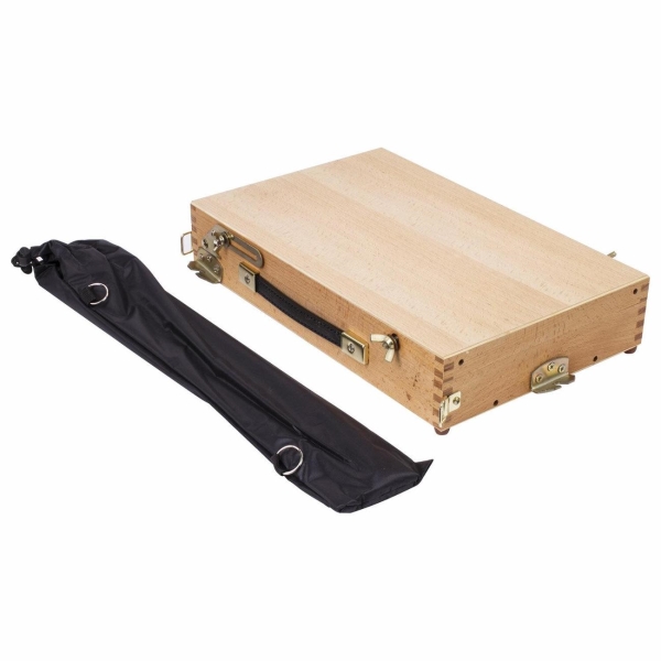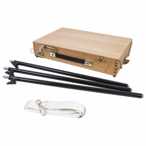 Изготовлен из натурального бука, пропитанного маслом, с применением качественной фурнитуры. Оснащен ящиком для хранения кистей и палитрой для красок. Этюдник позволяет комфортно работать как сидя, так и стоя, благодаря съемным телескопическим ножкам из металла длиной 90 см и регулирующему наклону холста с его максимальной высотой до 70 см. Для удобства переноски имеется регулируемый тесемный ремень.