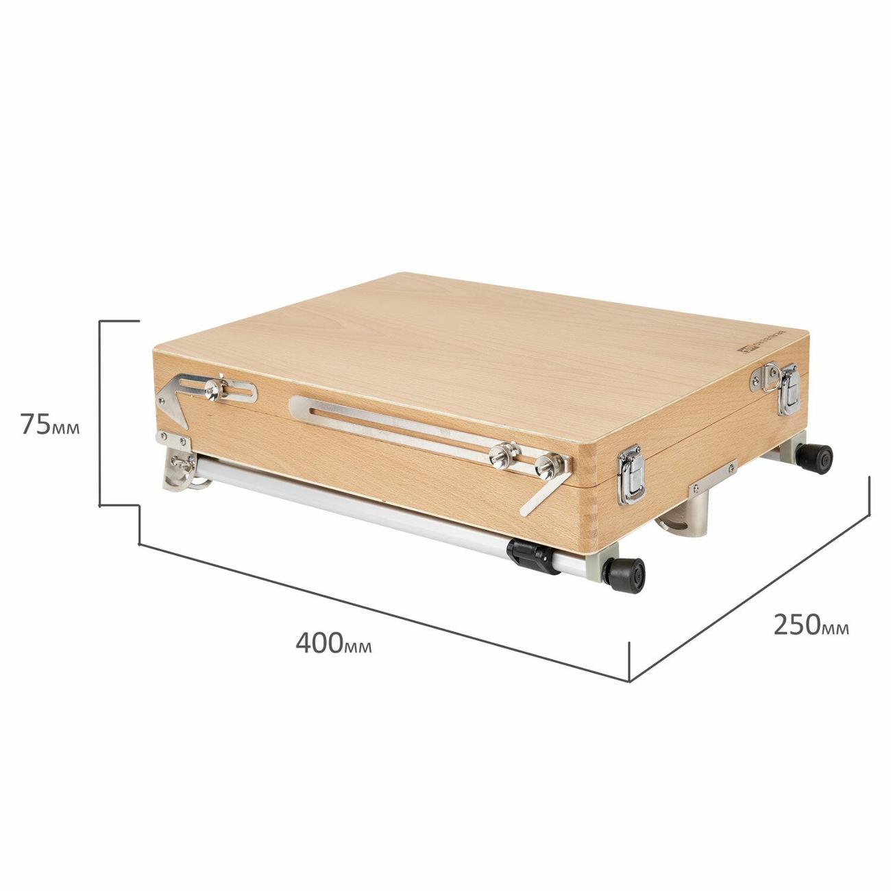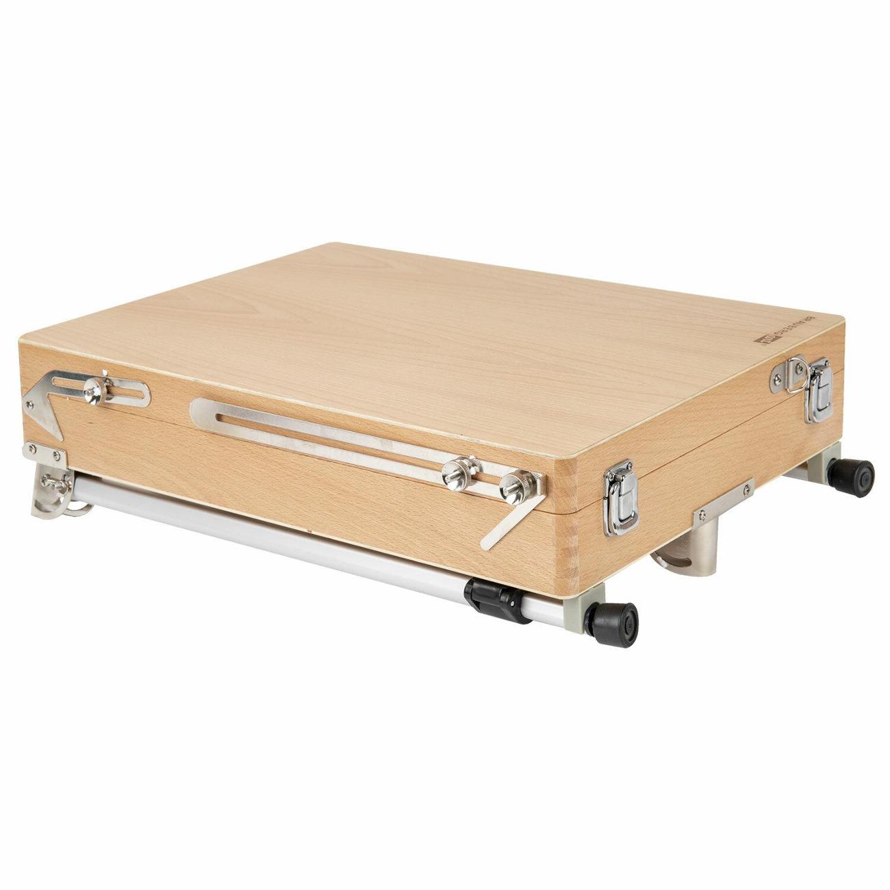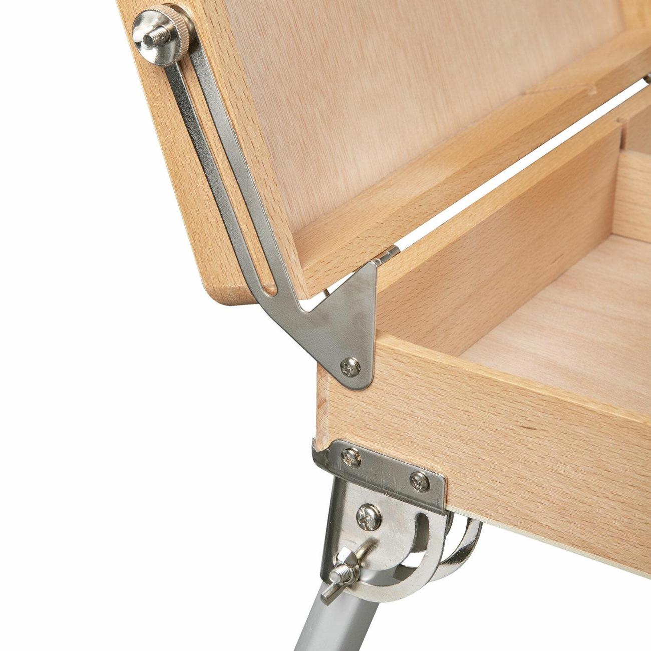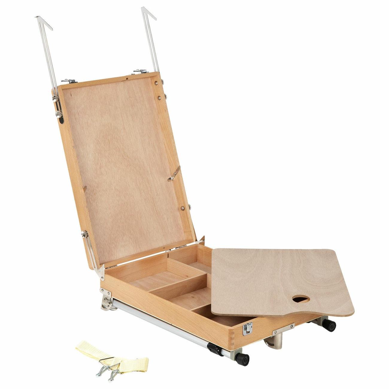 Этюдник изготовлен из натурального бука, пропитанного маслом, с применением качественной фурнитуры. Оснащен ящиком для хранения кистей, красок и других принадлежностей. В комплект входит деревянная палитра. Этюдник позволяет комфортно работать как сидя, так и стоя благодаря съемным алюминиевым телескопическим ножкам длиной 77 см и регулирующему наклону холста с его максимальной высотой до 60 см. Для удобства переноски имеется регулируемый тесемный ремень и ручка.