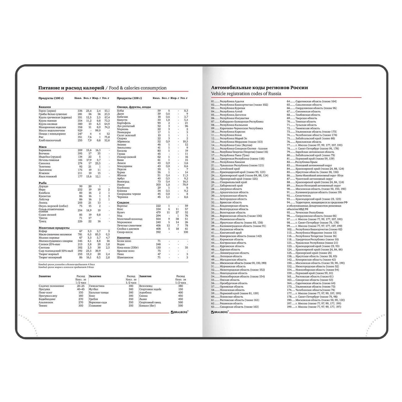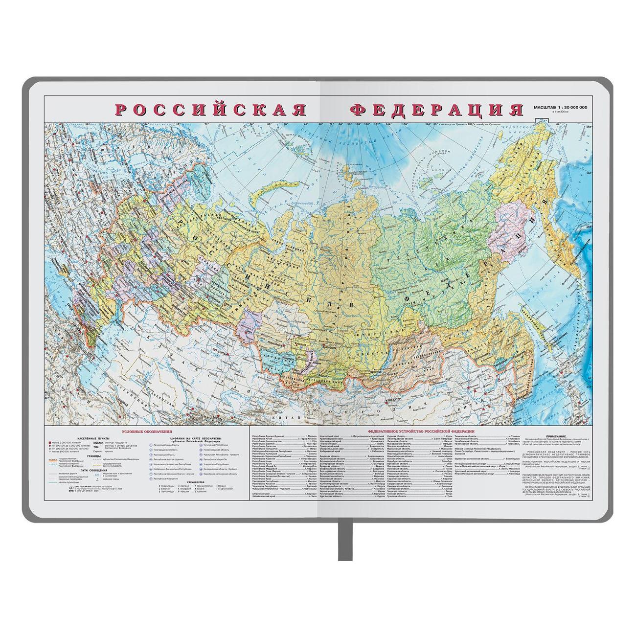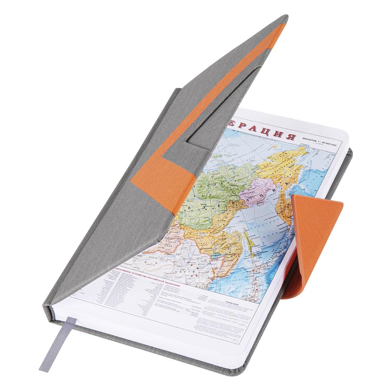 Форзац ежедневника представлен картами мира и России. Дополнением является закладка-ляссе, с помощью которой при необходимости можно быстро открыть ежедневник на нужной странице. Помимо прочего ежедневник снабжен справочным материалом. В конце ежедневника есть 7 страниц для записей и заметок. Выполнен в комбинации из двух цветов - серого и оранжевого.