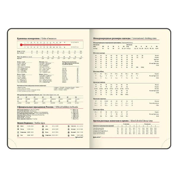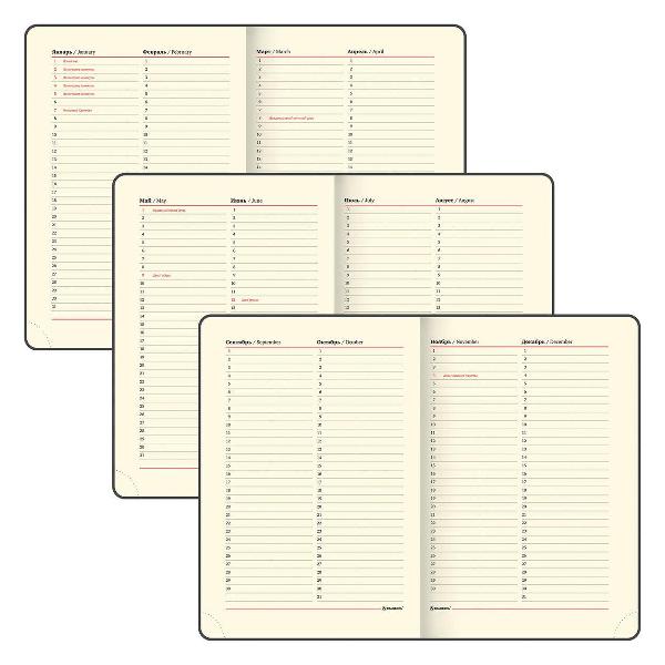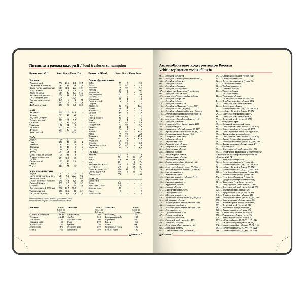 Дополнением является закладка-ляссе, с помощью которой при необходимости можно быстро открыть ежедневник на нужной странице. Помимо прочего ежедневник снабжен справочным материалом. В конце ежедневника есть 7 страниц для записей и заметок.