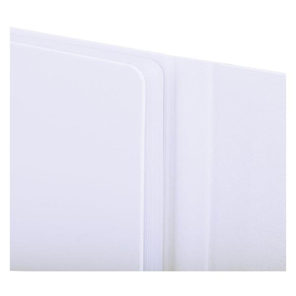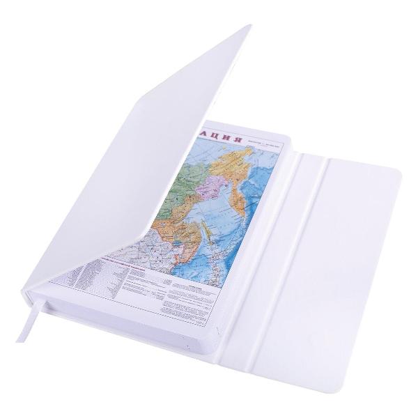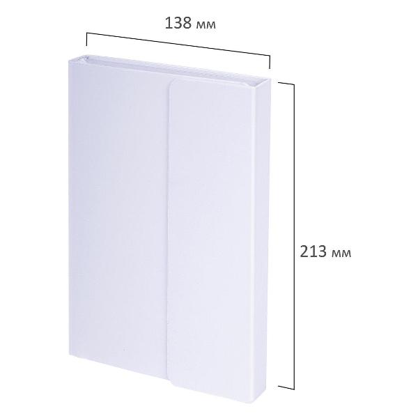 Внутренний блок включает 160 листов белой бумаги плотностью 70 г/м2. Каждая страничка имеет перфорированный угол. Твердая обложка, выполненная в классическом белом цвете и стилизованная под гладкую кожу, фиксируется магнитным клапаном, поэтому ежедневник не откроется в сумке или портфеле и страницы не помнутся.