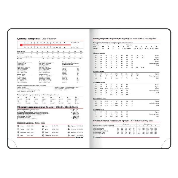 Подходит для горячего тиснения. Дополнением является закладка-ляссе, с помощью которой при необходимости можно быстро открыть ежедневник на нужной странице. Помимо прочего ежедневник снабжен обширным справочным материалом. В конце ежедневника есть 7 страниц для записей и заметок.