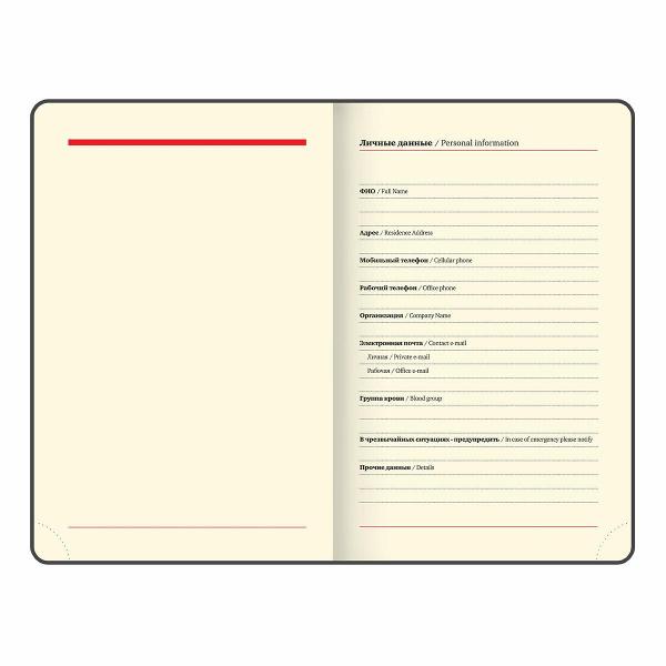 Внутренний блок включает 160 листов тонированной бумаги плотностью 70 г/м2. Каждая страничка имеет перфорированный угол. Благодаря формату А6 (100х150 мм) ежедневник удобно использовать как в офисе, так и на выездных деловых встречах.