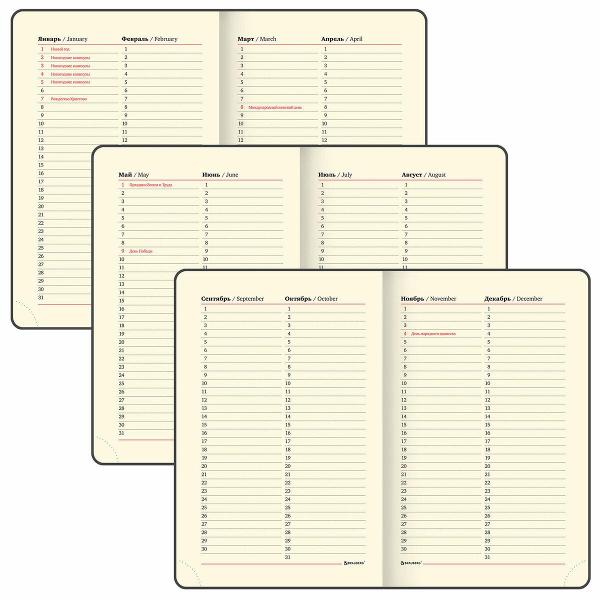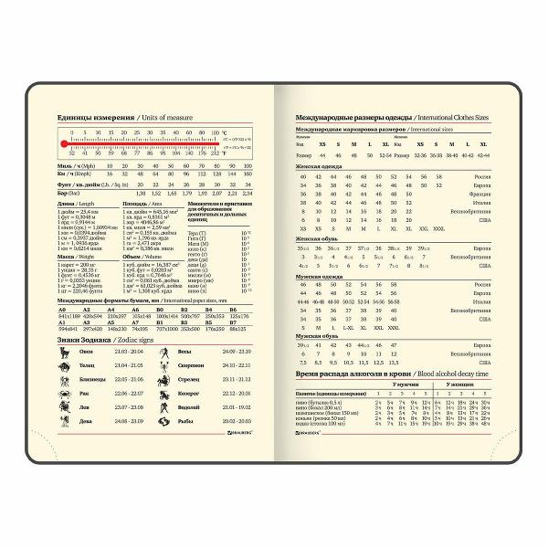 Твердая обложка, стилизованная под кожу рептилии, подходит для горячего тиснения. Срез ежедневника фольгирован под "золото", что придает ему особый шарм. Дополнением является закладка-ляссе, с помощью которой при необходимости можно быстро открыть ежедневник на нужной странице. Помимо прочего ежедневник снабжен обширным справочным материалом. В конце ежедневника есть 5 страниц для записей и заметок.