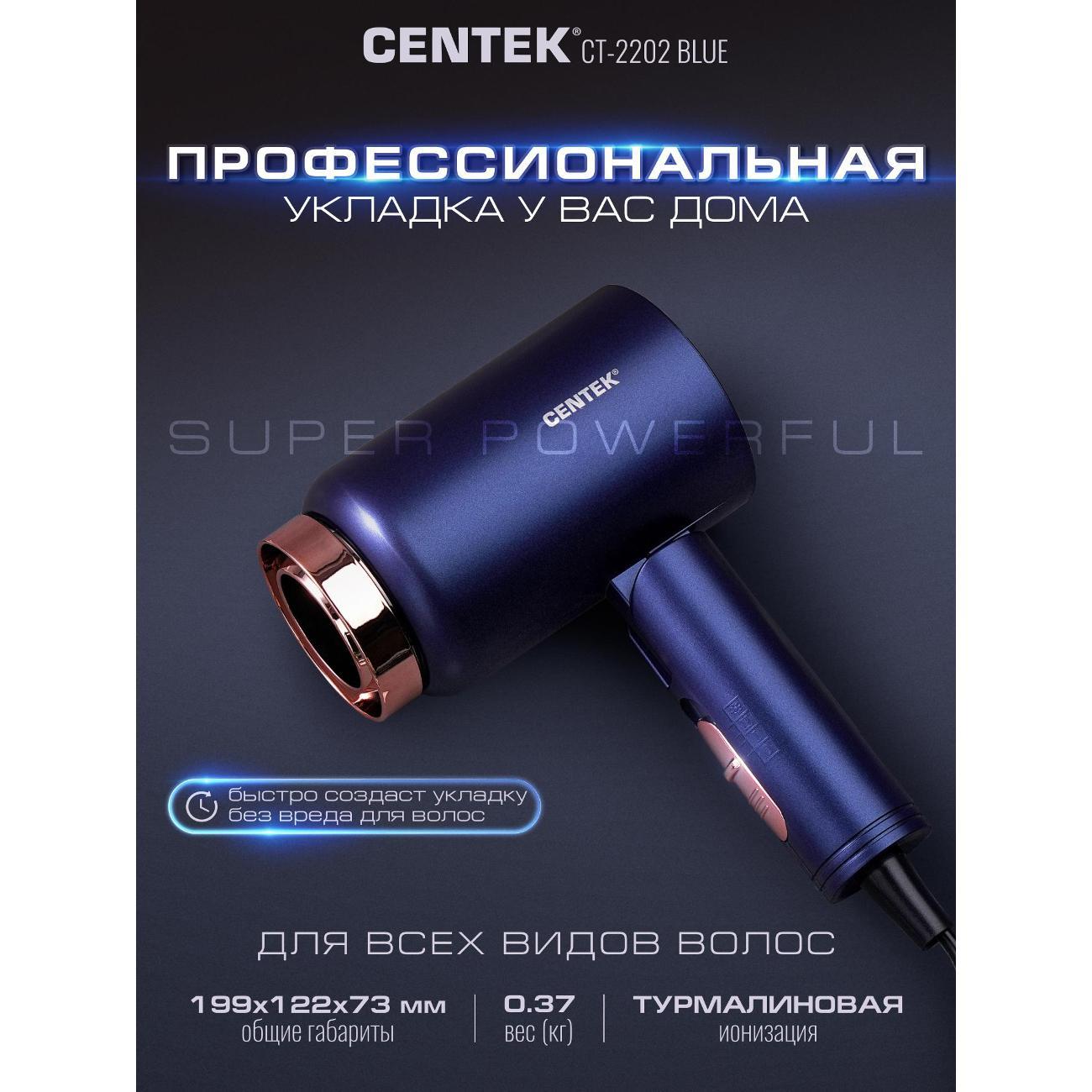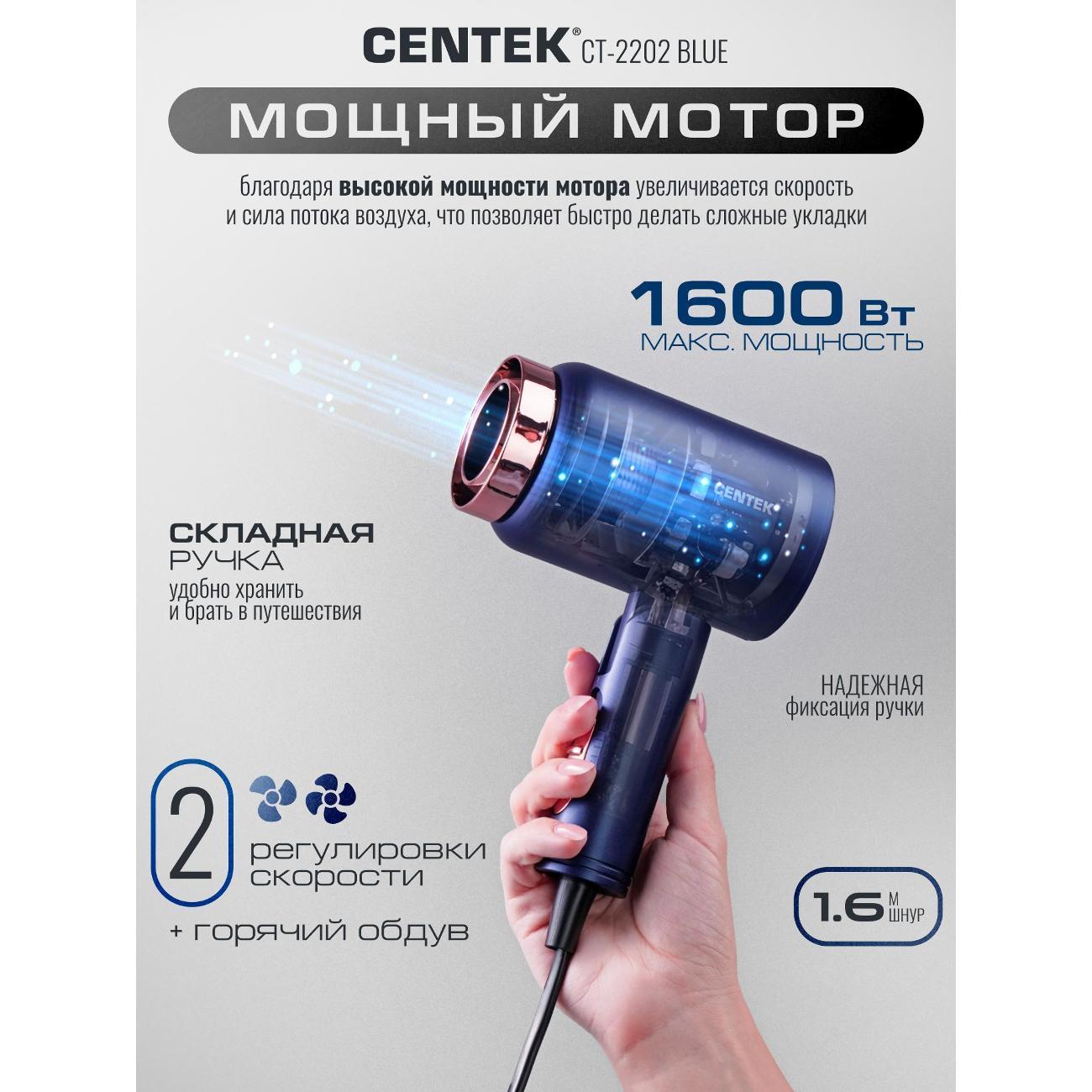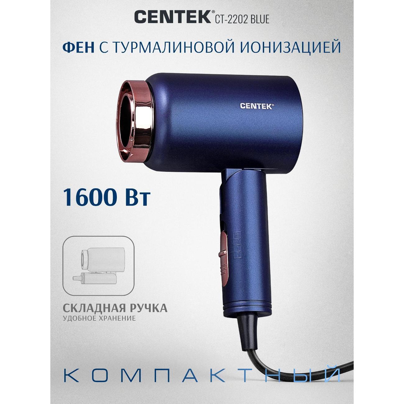 Фен для волос CENTEK СТ-2202 Blue- это уникальный инструмент для ухода за волосами. Модель позиционируется как бюджетное решение для ежедневного ухода и путешествий. Фен сочетает в себе высокий уровень мощности, современный стильный дизайн, который подойдет к любому интерьеру. Мощность 1600 Вт — достаточная для быстрой сушки волос средней длины и густоты. Турмалиновая ионизация - снижает статическое электричество, придаёт волосам блеск и гладкость. Модель оснащена складной ручкой, которую удобно хранить и перевозить. Мощный воздушный поток и нагрев способны справиться даже с самыми непослушными волосами. Три режима работы позволяют подобрать оптимальный вариант для разных типов волос и задач. Модель СТ-2202 подойдет для тех, кому нужен недорогой фен для ежедневной сушки, важна компактность и лёгкость, не планируете сложные укладки с насадками, ищете простое управление без лишних режимов. Centek CT 2202 Blue— практичный и недорогой фен для базового ухода за волосами. Он подойдёт для быстрой сушки прямых волос, путешествий и тех, кто не хочет тратить много на прибор с ограниченным набором задач. При бережном обращении прослужит длительный срок и станет удобным помощником в ежедневном уходе. Для тех, кто ищет бюджетный вариант модель Centek CT 2202 -отличное соотношение цены и базовых возможностей. Сохраняйте красоту и здоровье волос вместе с CENTEK!