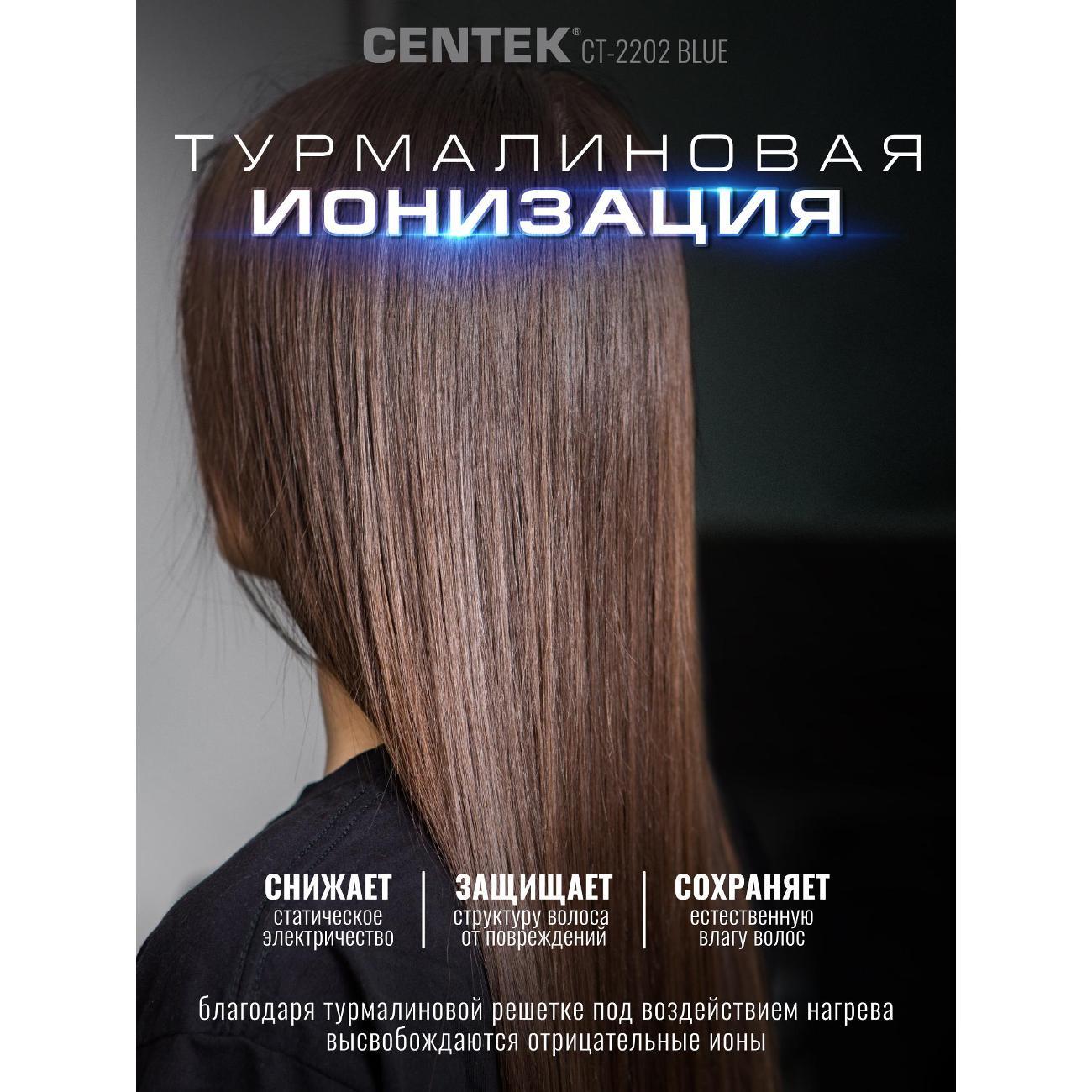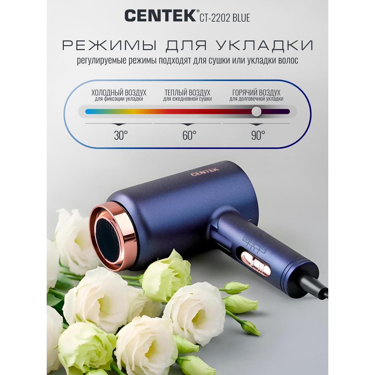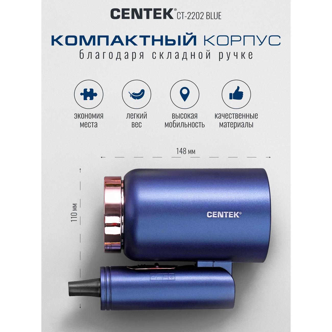 Фен для волос CENTEK СТ-2202 Blue- это уникальный инструмент для ухода за волосами. Модель позиционируется как бюджетное решение для ежедневного ухода и путешествий. Фен сочетает в себе высокий уровень мощности, современный стильный дизайн, который подойдет к любому интерьеру. Мощность 1600 Вт — достаточная для быстрой сушки волос средней длины и густоты. Турмалиновая ионизация - снижает статическое электричество, придаёт волосам блеск и гладкость. Модель оснащена складной ручкой, которую удобно хранить и перевозить. Мощный воздушный поток и нагрев способны справиться даже с самыми непослушными волосами. Три режима работы позволяют подобрать оптимальный вариант для разных типов волос и задач. Модель СТ-2202 подойдет для тех, кому нужен недорогой фен для ежедневной сушки, важна компактность и лёгкость, не планируете сложные укладки с насадками, ищете простое управление без лишних режимов. Centek CT 2202 Blue— практичный и недорогой фен для базового ухода за волосами. Он подойдёт для быстрой сушки прямых волос, путешествий и тех, кто не хочет тратить много на прибор с ограниченным набором задач. При бережном обращении прослужит длительный срок и станет удобным помощником в ежедневном уходе. Для тех, кто ищет бюджетный вариант модель Centek CT 2202 -отличное соотношение цены и базовых возможностей. Сохраняйте красоту и здоровье волос вместе с CENTEK!