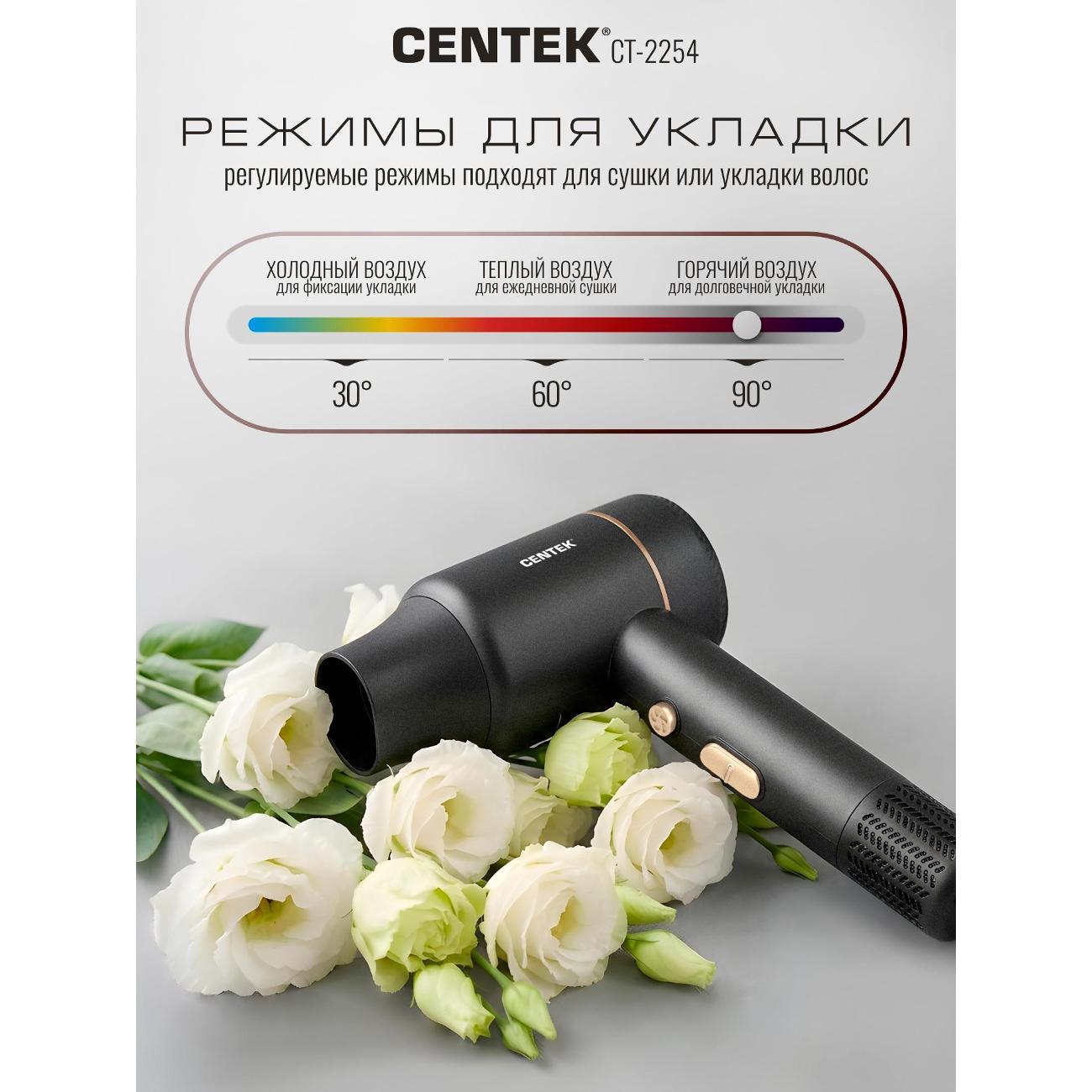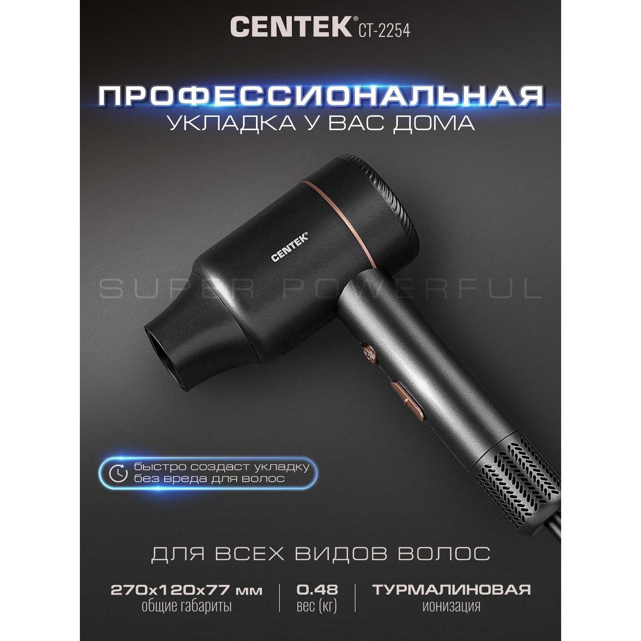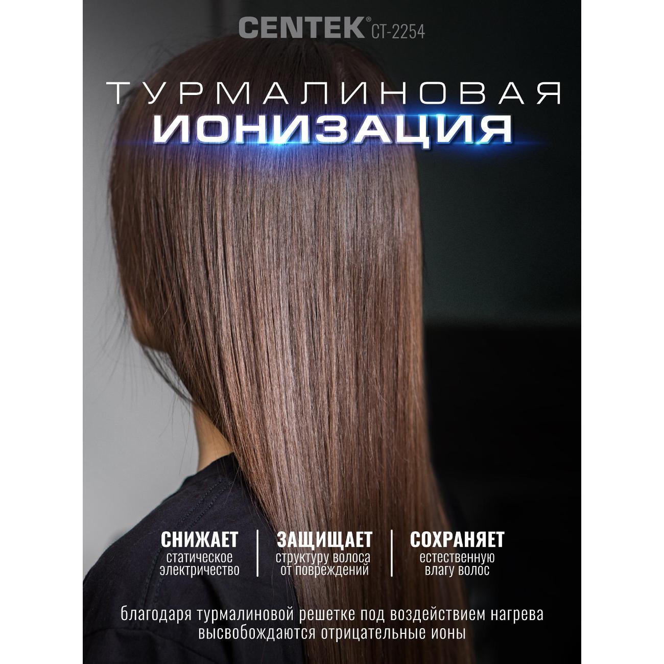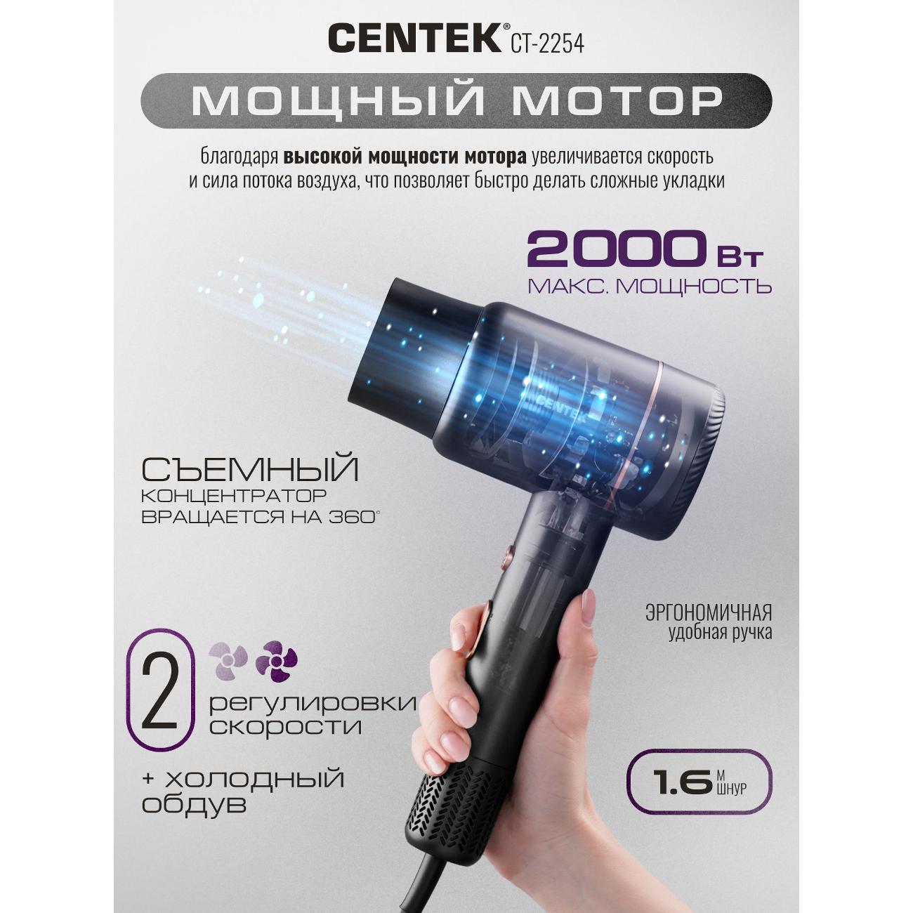Фен для волос Centek CT-2254 с турмалиновой ионизацией - это мощный и функциональный инструмент для ухода за волосами в трендовом цвете. Фен быстро и эффективно помогает создать стильную укладку, не тратя много времени и усилий и обеспечить вашим волосам салонный уход дома. Модель CT-2254 сочетает высокую производительность и деликатное воздействие на волосы. Ионизация минимизирует негативное воздействие горячего воздуха на волосы. Мощный мотор на 2000 Вт создает интенсивный воздушный поток, который сокращает время сушки даже для густых волос. Три температурных режима и две скорости профессионального фена для волос позволяют выбрать оптимальные параметры укладки, подходящие именно вашим локонам. Функция холодного обдува и ионизация помогут закрепить укладку, разгладить волосы, придавая им объём и стойкость формы на весь день. Насадка-концентратор облегчает процесс укладки, обеспечивая точное направление воздушного потока, облегчая и ускоряя процесс создания прически. Лёгкий и удобный дизайн подходит для хранения в небольшом пространстве. Компактные размеры и небольшой вес позволяют брать фен в поездки. Продуманная форма корпуса и баланс веса снижают усталость руки при длительной укладке. Фен для волос CT-2254 станет прекрасным подарком для любой женщины, ценящей красоту и уход за собой. Centek CT 2254 — надёжный и функциональный фен для домашнего использования. Он сочетает мощность, технологии бережного ухода и удобство в обращении. При соблюдении правил эксплуатации прослужит много лет и станет удобным инструментом для ежедневной сушки и укладки. Простой и надежный в использовании, фен станет незаменимым помощником в создании идеальных волос. Такой фен подходит как для профессионалов, так и для бытового использования. Сохраняйте красоту и здоровье волос вместе с CENTEK!