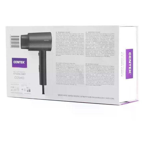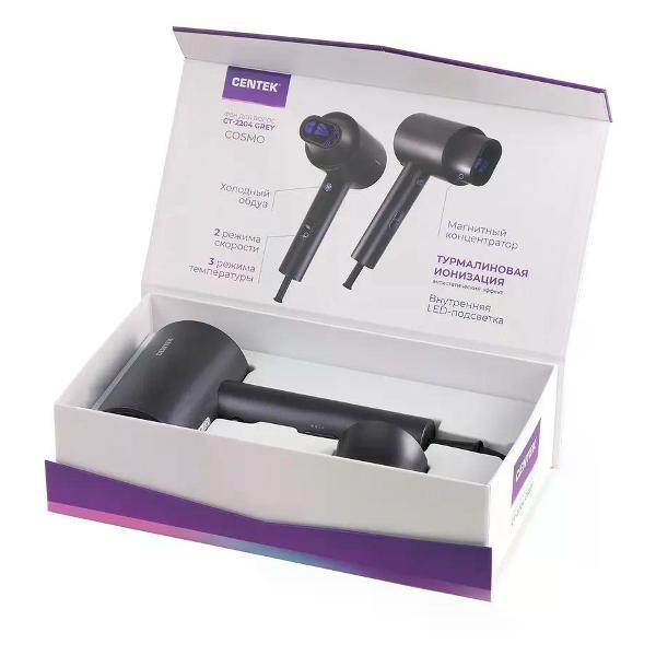 Фены отличаются не только технологиями, но и эргономикой. Легкие, сбалансированные модели с прорезиненными ручками и поворотными шнурами делают процесс сушки удобным. Дополнительные функции, такие как режим холодного воздуха для фиксации укладки, кнопка экстренного охлаждения или фильтр, защищающий от втягивания волос, повышают комфорт и безопасность. Мощный и тихий мотор — залог эффективной работы. Этот прибор является основой для любой домашней укладки, превращая влажные волосы в готовую к дальнейшему моделированию прическу. Фен для волос CENTEK СТ-2204 – уникальное сочетание современного стиля и мощности Характеристики товара: Мощность: 2000 Вт. Кол-во скоростей: 2. Кол-во режимов: 3. Особенности: Внутренняя LED-подсветка, Магнитный концентратор, Турмалиновая ионизация. Материал корпуса: Пластик. Гарантия: 1 год.