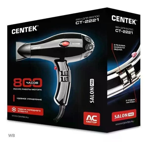 Фен-это устройство которое не только является неотъемлемой частью быта прекрасной половины человечества, но и традиционно служит подарком на 8-е марта или день рождения. В линейке торговой марки CENTEK, покупатель найдёт всё, что ему необходимо, от небольших фенов со складной ручкой для путешествий, до мощных, профессиональных устройств. А премиальная упаковка послужит поводом для того, чтобы сделать хороший подарок нашим любимым. К фену CT-2221 торговой марки CENTEK, относятся следующие характеристики :Цвет - Черный,Мощность - 2200 Вт,Профессиональный мотор,2 режима скорости,3 температурных режима,Режим холодного обдува,Защита от перегрева. Опции : Концентратор,Петелька для подвешивания,Съемная крышка фильтра.