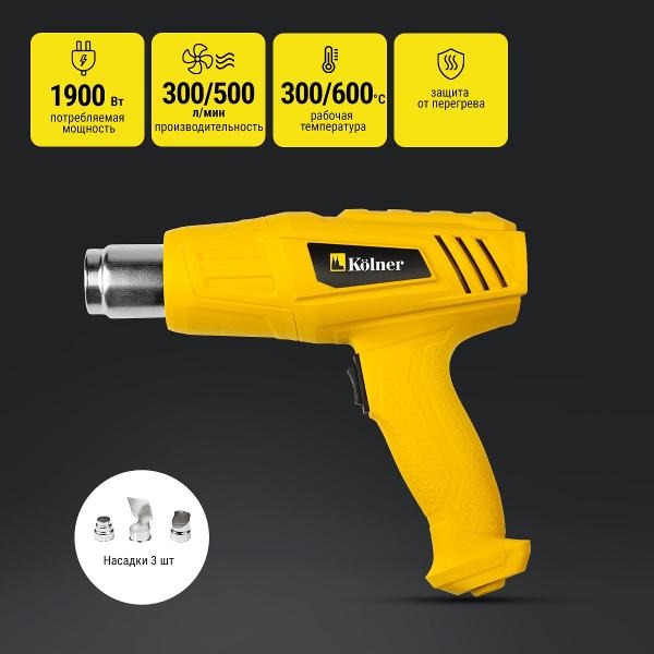 Строительный фен Kolner KHG 1900 желтого цвета с двумя режимами работает от сети, оснащен системой защиты от перегревания. Длина шнура составляет 2 м. Мощность прибора — 1,9 кВт. Габариты модели — 20х7х22 см. Вес изделия — 700 г. Корпус сделан из прочного пластика и ПВС. Рукоятка надежно сидит в ладони, не скользит. Рабочая температура регулируется ступенчатым способом от 300°C до 600°C. Производительность устройства — от 300 до 500 л/мин. Небольшой вес и продуманный форм-фактор снижают нагрузку на кисть.
