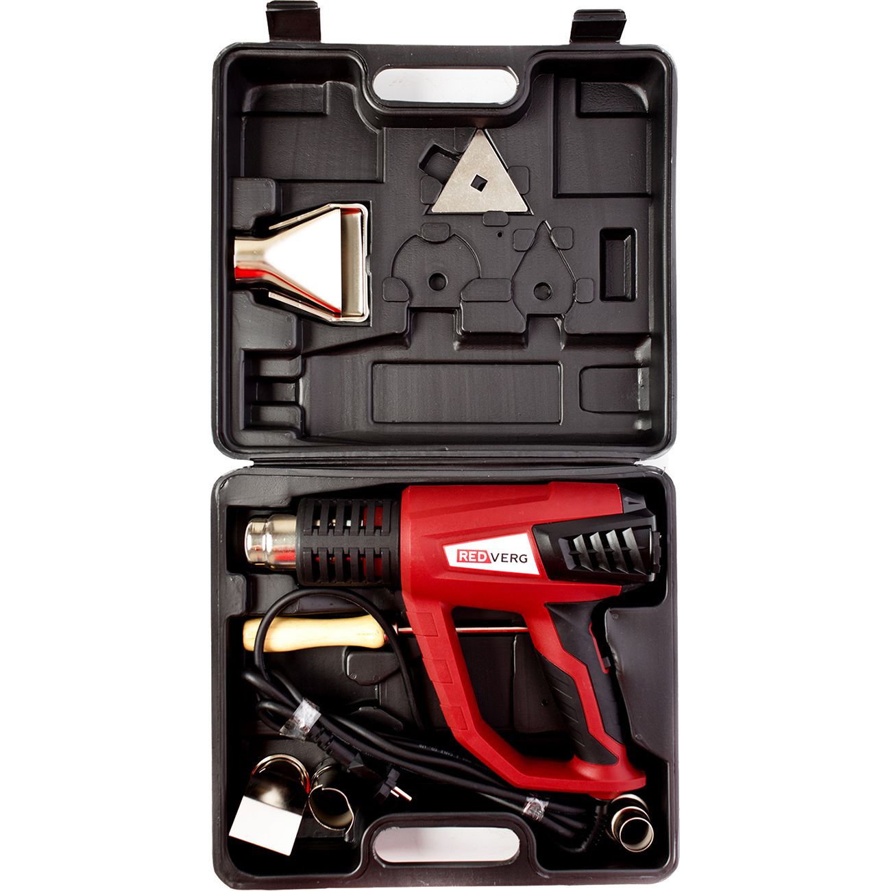 Фен строительный Redverg RD-HG2000D работает от электросети на 220 В. Мощность прибора — 2000 Вт. Температура нагрева регулируется в диапазоне от 50 до 600°. Максимальная скорость воздушного потока — 500 л/мин, а минимальная — 250 л/мин. Управление осуществляется с помощью механических кнопок, расположенных на корпусе. Заданные параметры отображаются на ЖК дисплее. Крыльчатка улучшенной конструкции обеспечивает интенсивный и равномерный поток воздуха. Есть рычаг выключения. В комплекте поставляется скребок для удаления лака и четыре сопла. Габариты: 275 х 110 х 375 мм. Вес прибора — 1,694 кг.