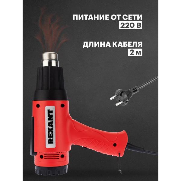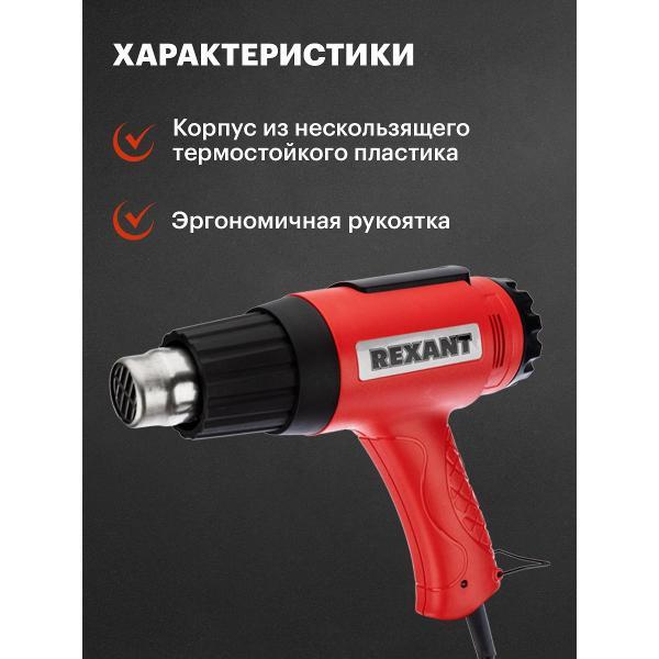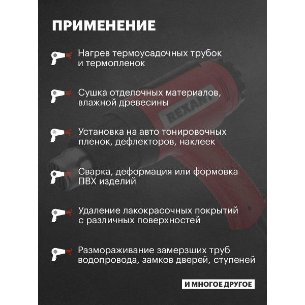 Строительный фен Rexant 12-0056 предназначен для нагрева термоусадочных трубок и пленок, сушки отделочных материалов, монтажа тонировочных и защитных пленок, сварки и формовки пластиков, удаления лакокрасочных покрытий и других задач. Расход воздуха составляет 350 л/мин.