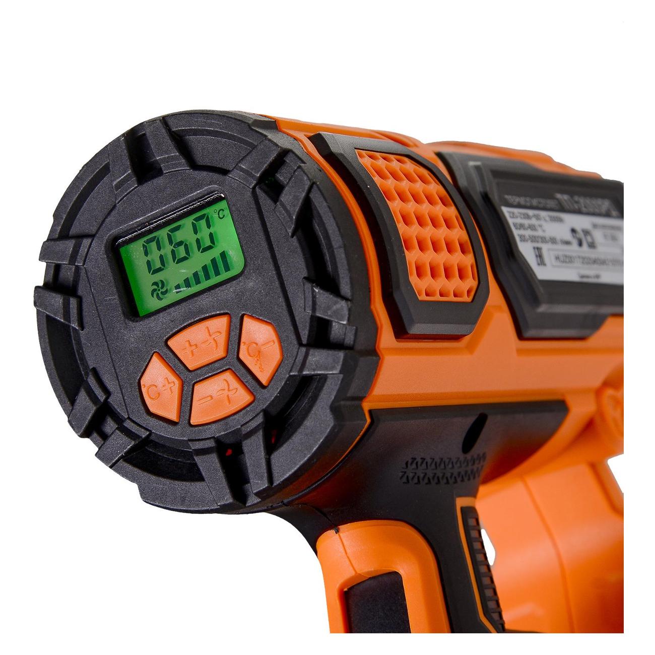 Корпус из прочного и износостойкого корпуса надежно защищает внутренние элементы от внешнего воздействия. Ступенчатый переключатель упрощает регулировку режима работы. Устройство оснащено кабелем длиной 1 м. Цвет корпуса — оранжевый. В комплект входит кейс. С ним легко хранить и транспортировать строительный фен и аксессуары, которые прилагаются к нему.