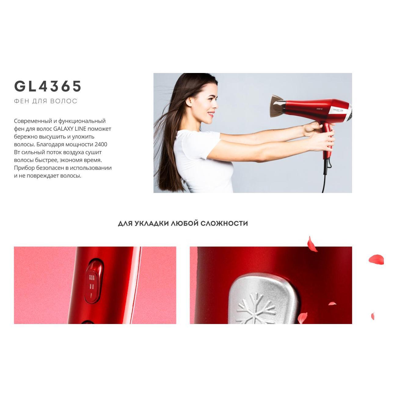 Вы можете купить Фен Galaxy LINE GL 4365 в магазинах М.Видео по доступной цене. Фен Galaxy LINE GL 4365: подробное описание, фото и отзывы реальных покупателей, характеристики, возможность скачать инструкции и подобрать аксессуары.