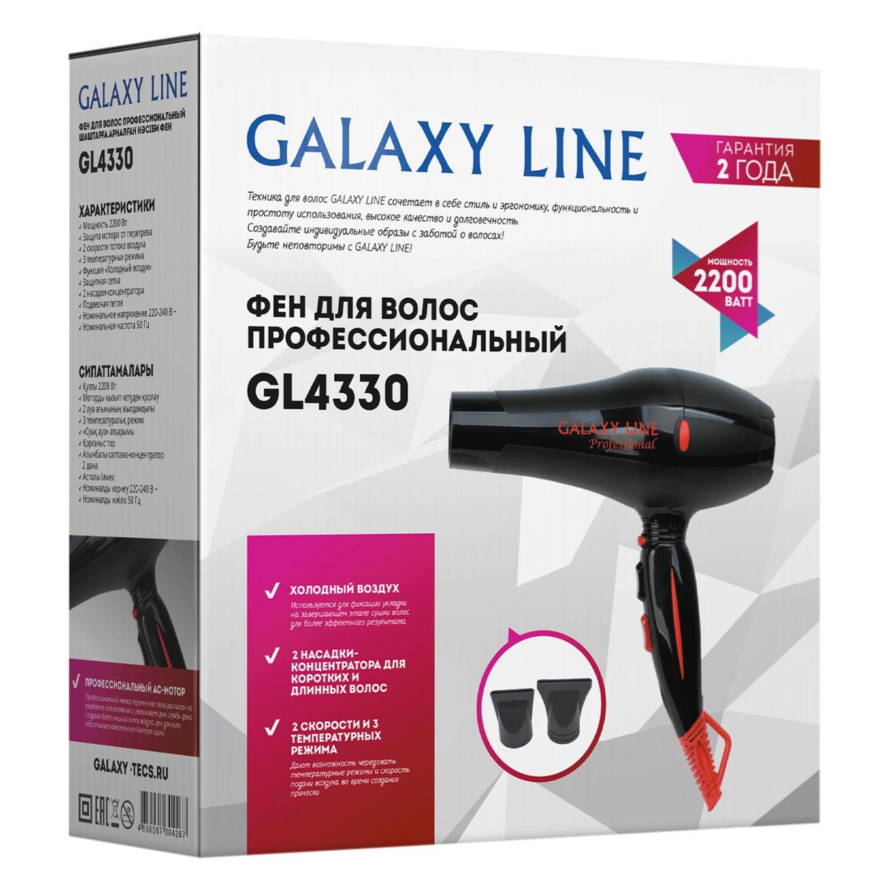 Корпус фена Galaxy Line GL4330 сделан из термостойкого пластика и прочного материала EVA. Устройство подключается к сети с помощью кабеля длиной 1,8 м, оснащенного вилкой типа С (евростандарт). Петля у основания шнура позволяет хранить прибор в подвешенном состоянии.