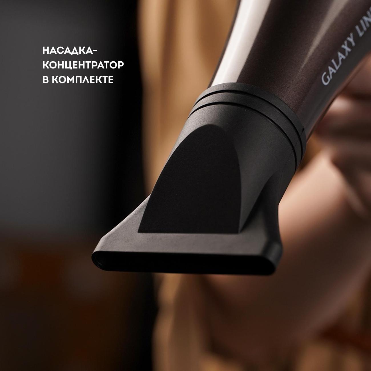 Фен Galaxy Line GL4343 с AC-мотором выдает мощность 2400 Вт. Настраивать интенсивность воздействия позволяют встроенные регуляторы — доступны две скорости потока и три температурных режима. Нажатием на кнопку запускается холодный обдув. В случае перегрева происходит автоматическое отключение, что делает эксплуатацию безопасной и предотвращает серьезные поломки.