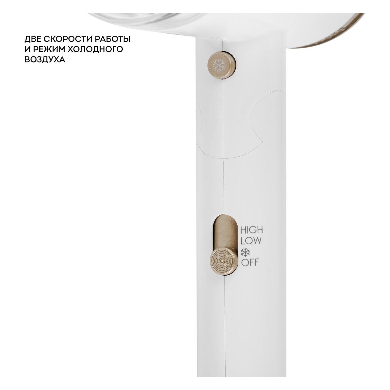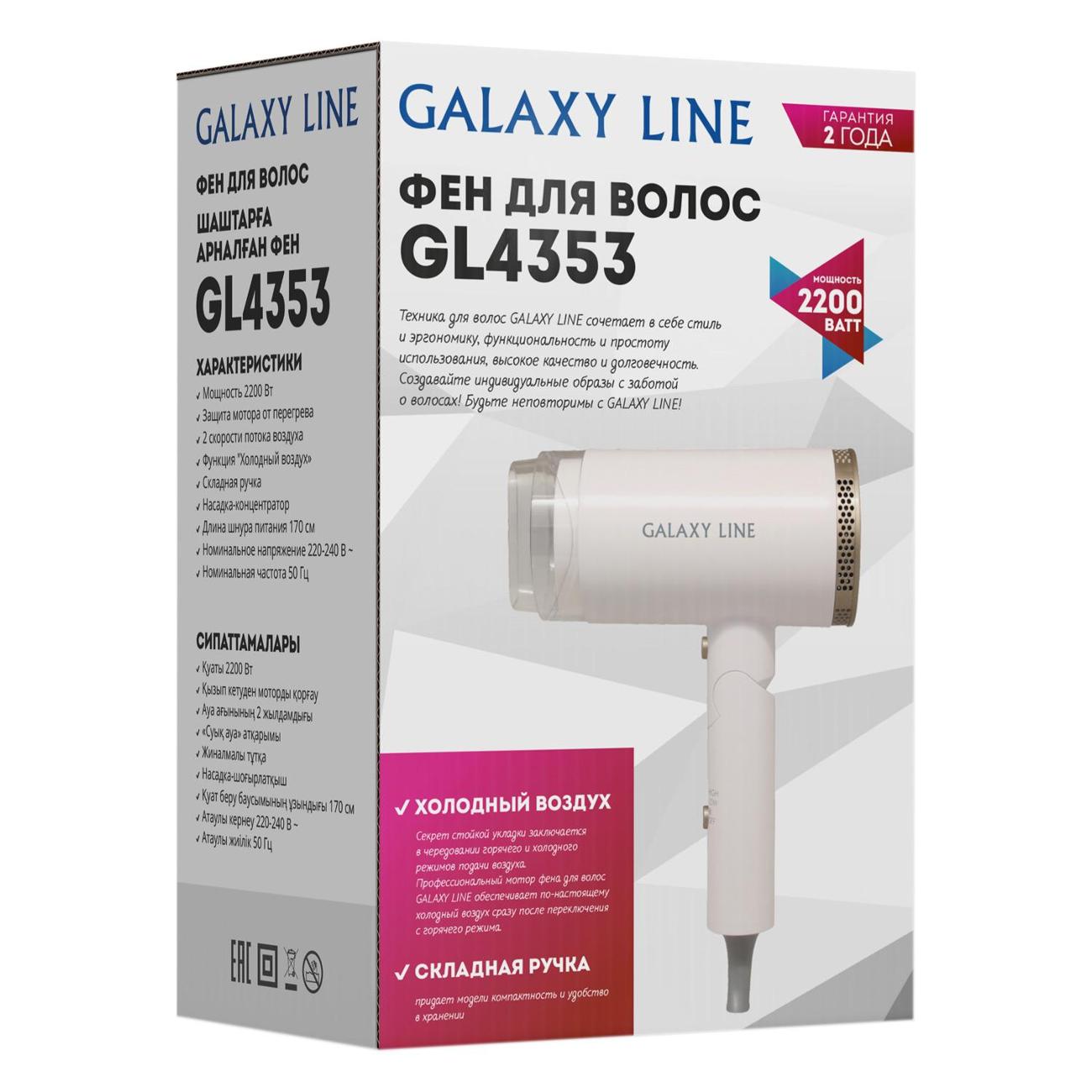 Фен Galaxy Line GL4353 в белом пластиковом корпусе снабжен складной ручкой. За счет такой конструкции модель компактна, что особенно удобно при хранении и перевозке. Блок управления зависимый. Предусмотрена отдельная кнопка для активации обдува холодным воздухом. Прибор работает на двух скоростях, воздушный поток достигает 10 м/с.