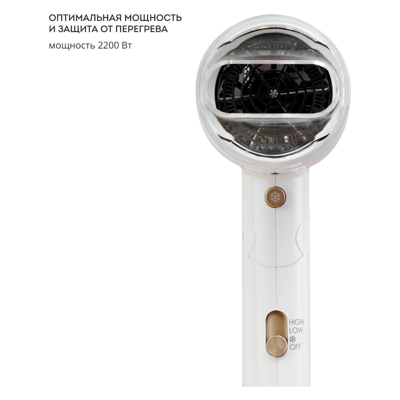 Фен получает питание от электросети напряжением 220-240 В, подключается с помощью кабеля длиной 170 см (вилка тип С). Потребляемая мощность DC-мотора составляет 2200 Вт. Скорость вращения двигателя достигает 15000 об/мин. При перегреве срабатывает система автоотключения. Размеры фена — 17х24,5 мм, вес — 536 г. В комплект входит насадка-концентратор.