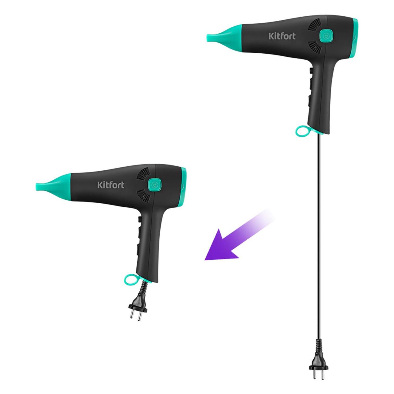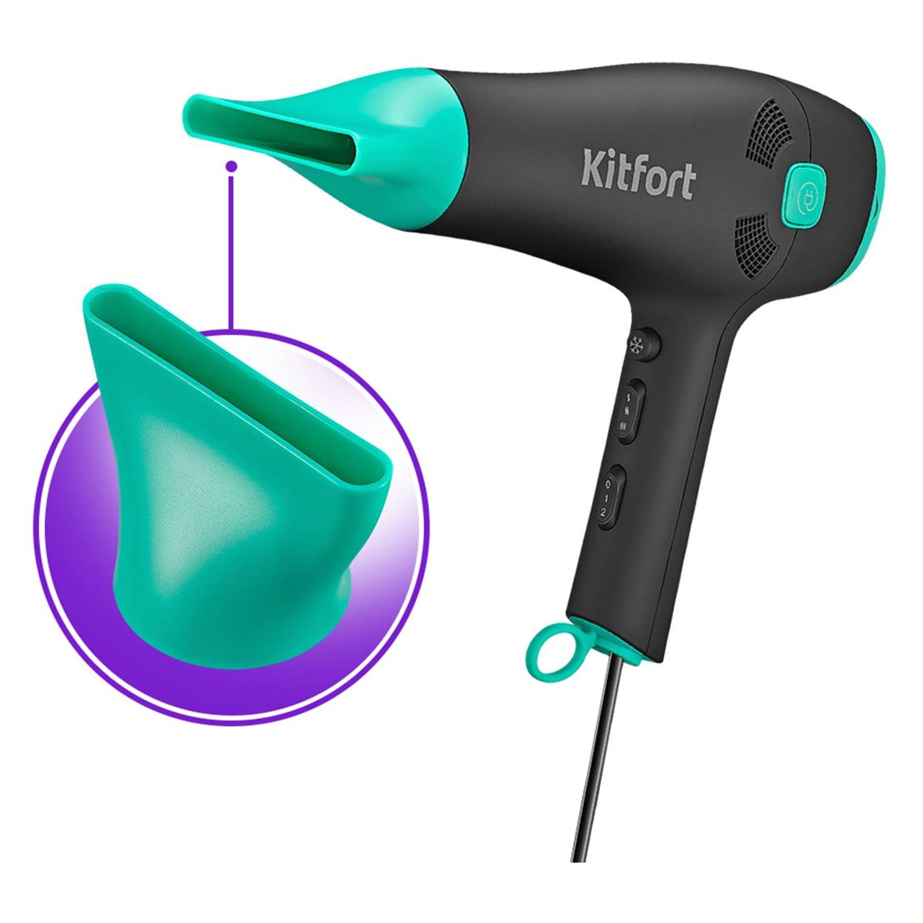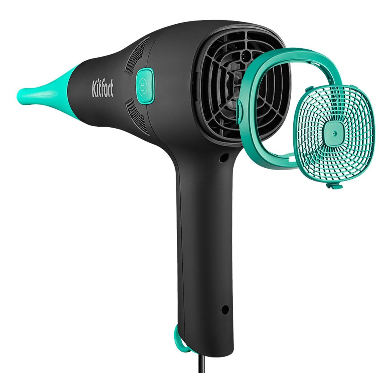 Фен Kitfort КТ-3222 в комбинированном корпусе черного и бирюзового цветов обладает габаритами 23,9х21,8х9,3 см и весом 610 г. Длина встроенного кабеля питания составляет 1,5 м. Есть петля для подвешивания. Корпус производится из пластика. Модель обладает съемной протекционной решеткой. Реализована технология автоматического выключения при перегреве. Комплектуется насадкой-концентратором.
