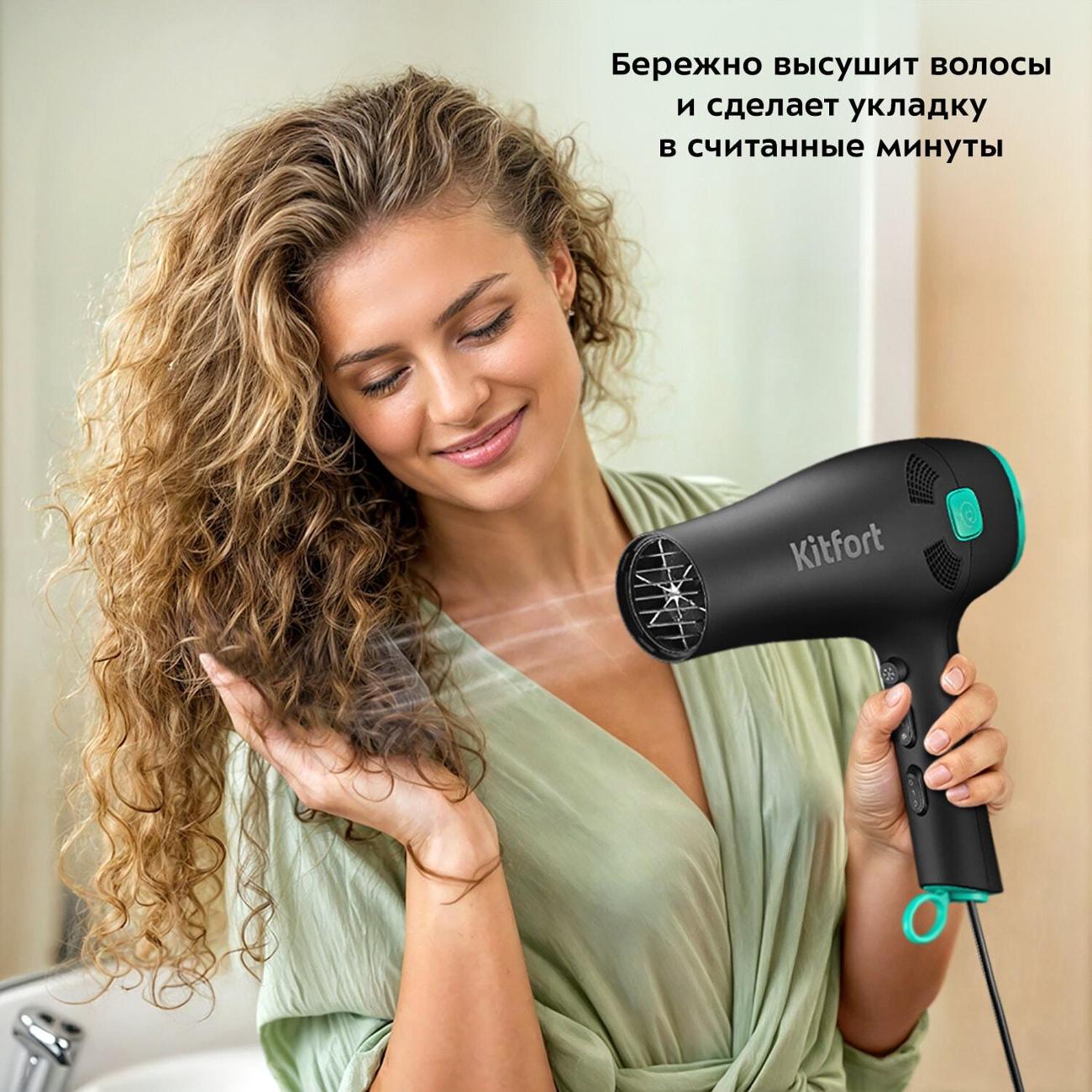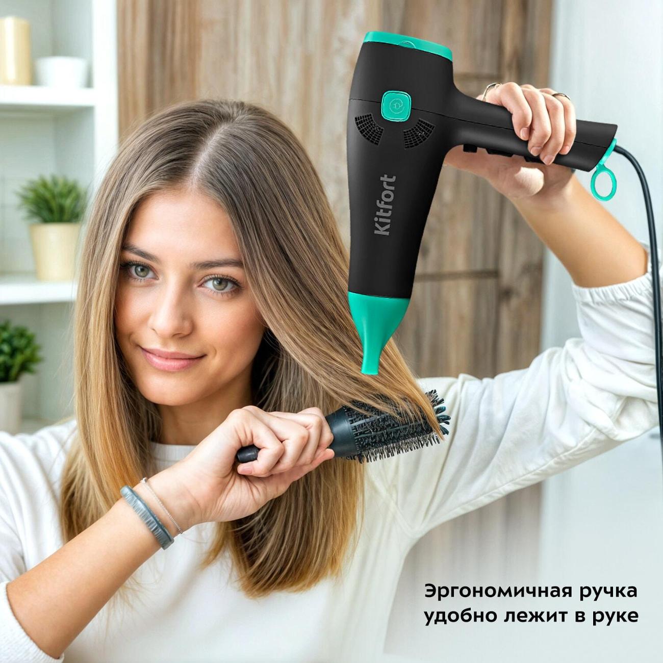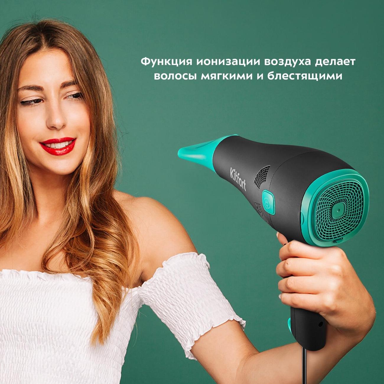 Фен Kitfort КТ-3222 в комбинированном корпусе черного и бирюзового цветов обладает габаритами 23,9х21,8х9,3 см и весом 610 г. Длина встроенного кабеля питания составляет 1,5 м. Есть петля для подвешивания. Корпус производится из пластика. Модель обладает съемной протекционной решеткой. Реализована технология автоматического выключения при перегреве. Комплектуется насадкой-концентратором.