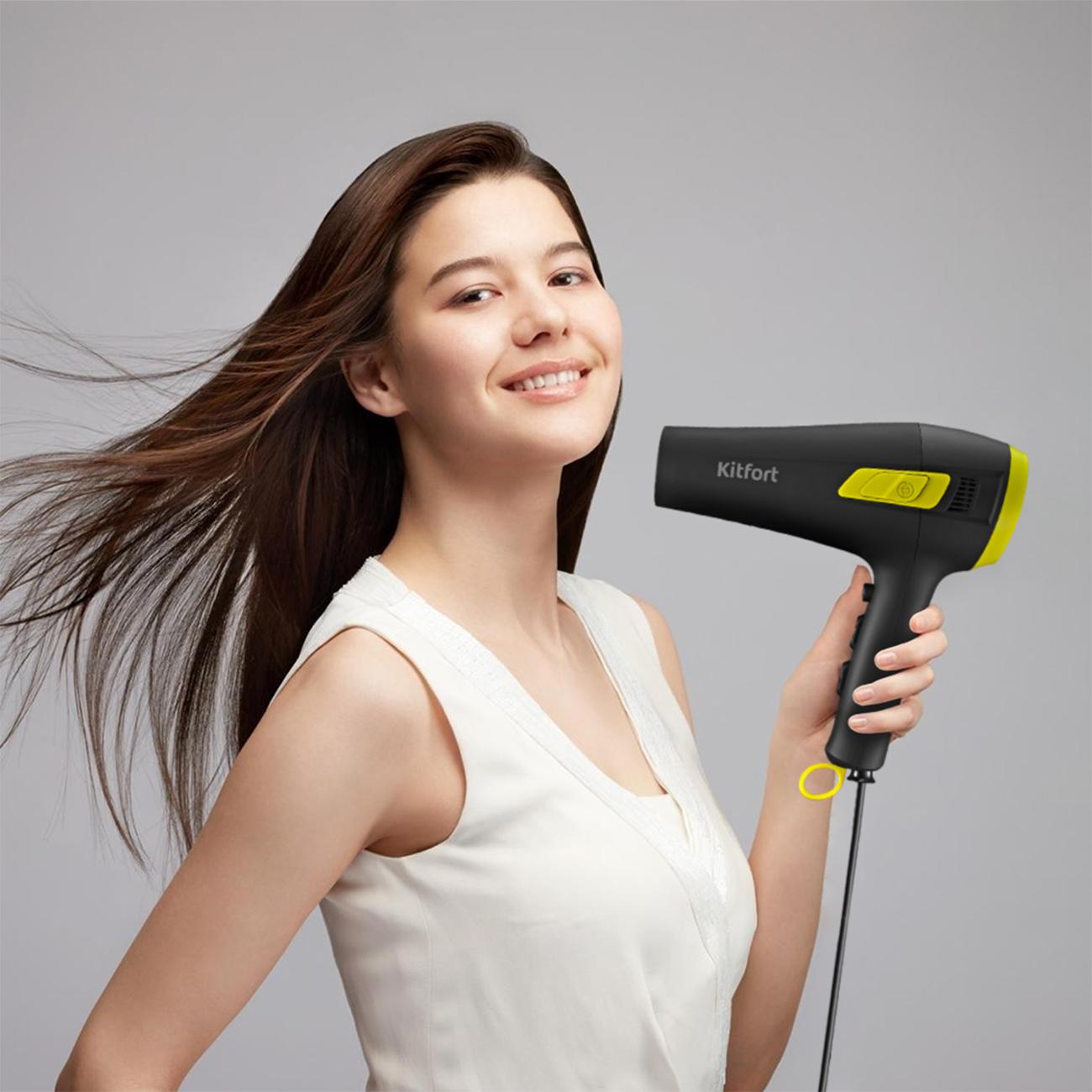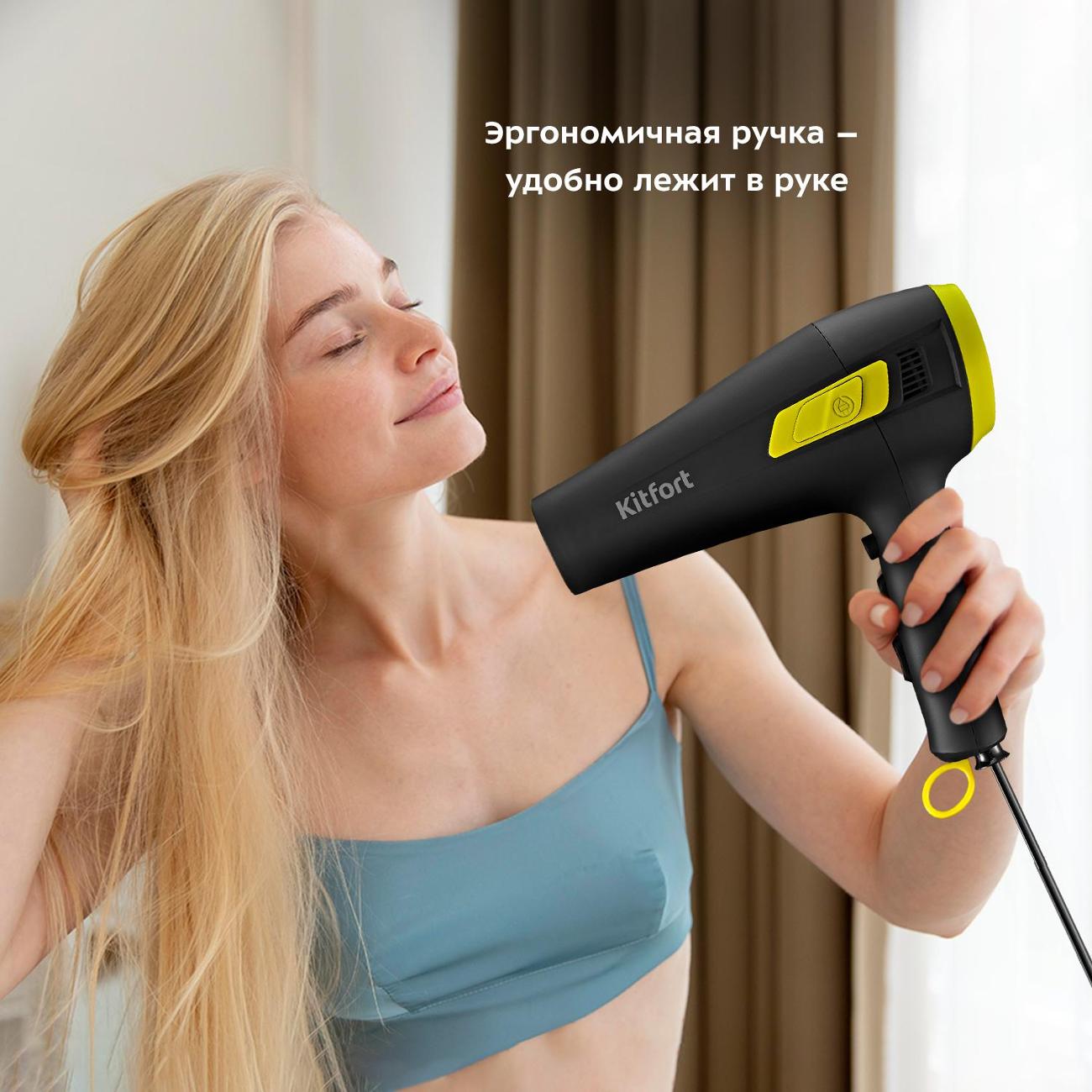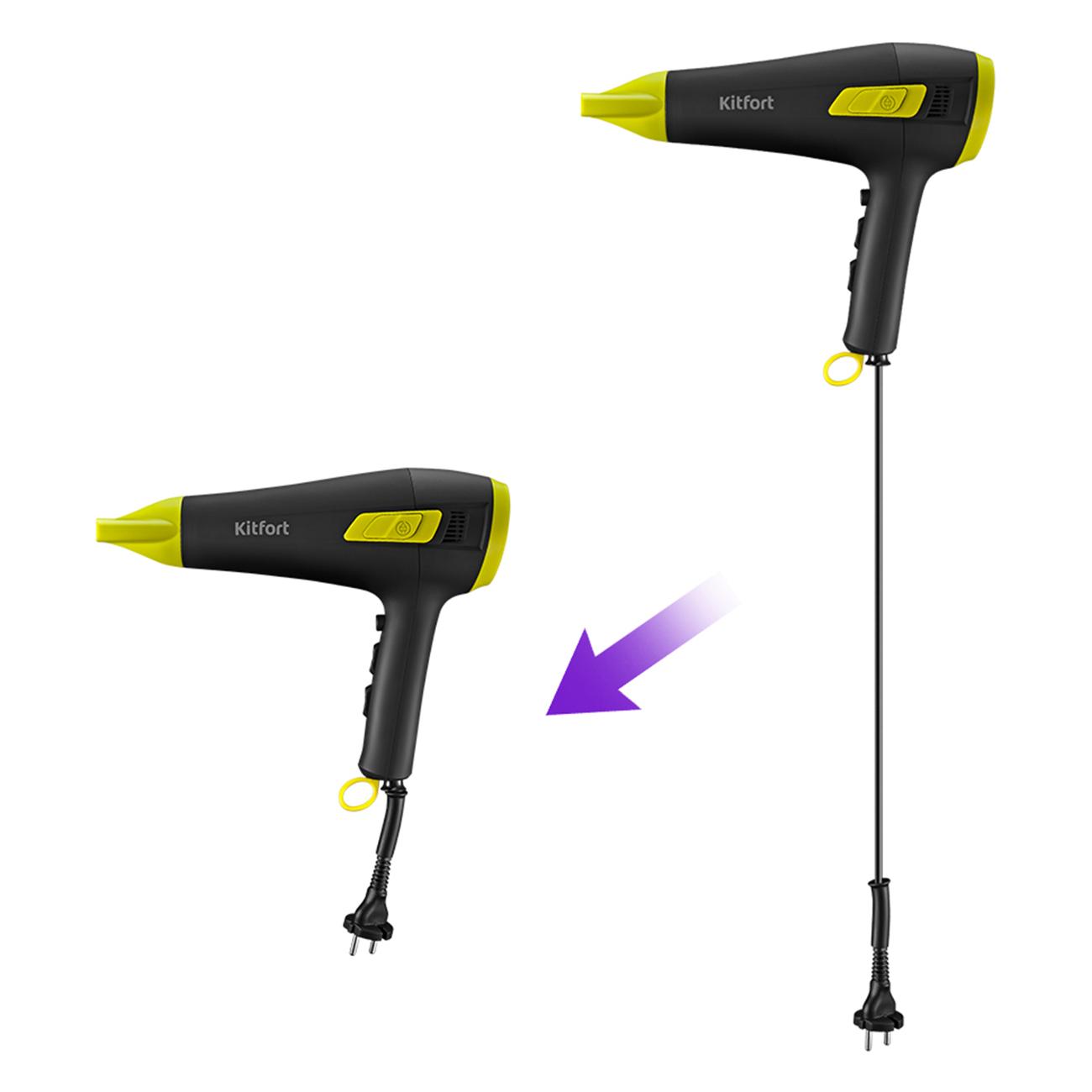 Фен Kitfort КТ-3223 в комбинированном корпусе черного и салатового цветов обладает массой 600 г. Габариты устройства составляют 24,9х22,8х9,4 см. Длина встроенного сетевого шнура — 1,5 м. Корпус фена изготавливается из пластика и оснащается петлей для подвешивания. В модели устанавливается съемная защитная решетка.